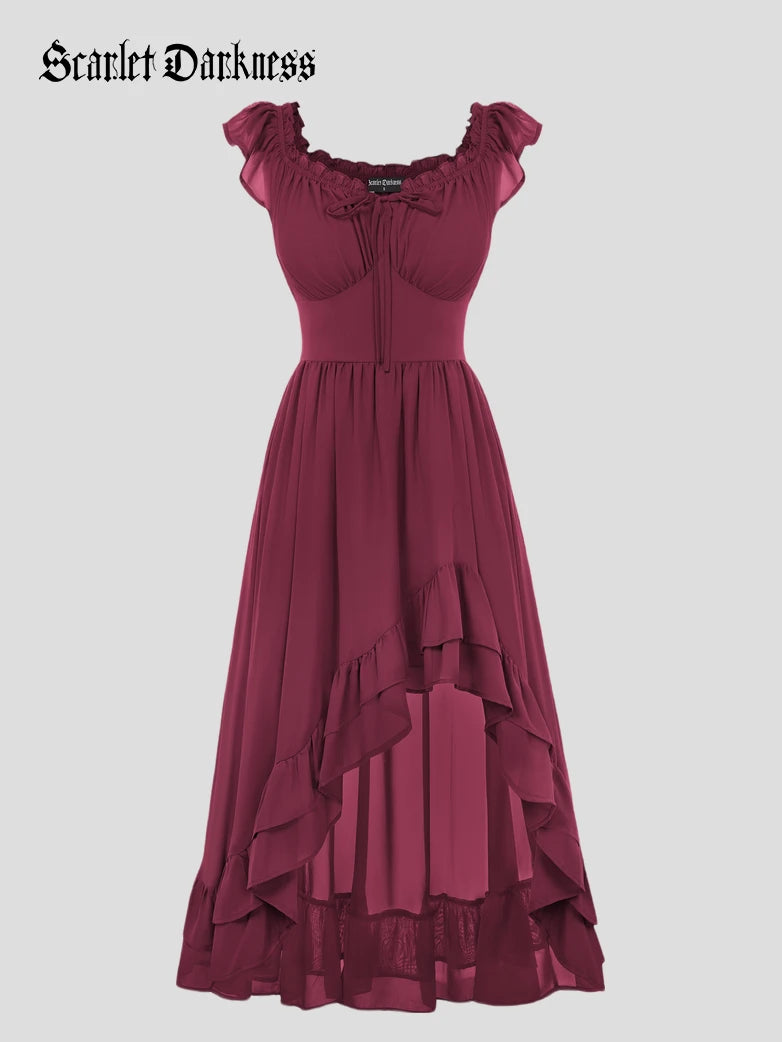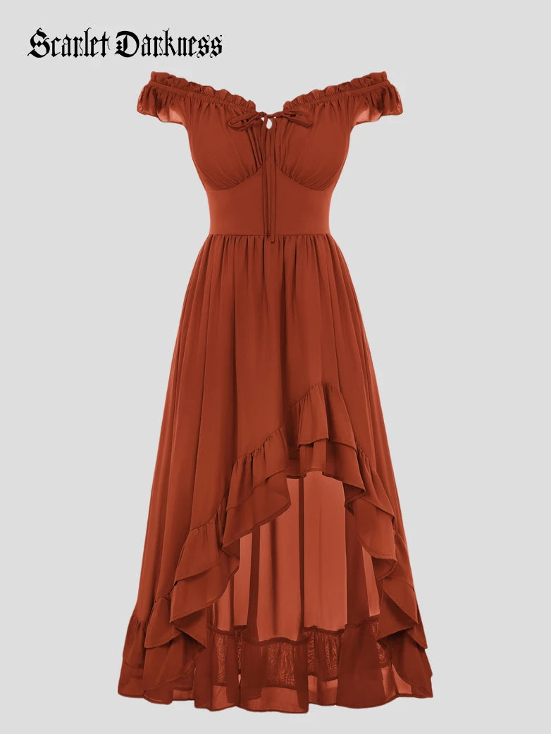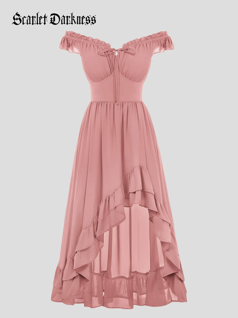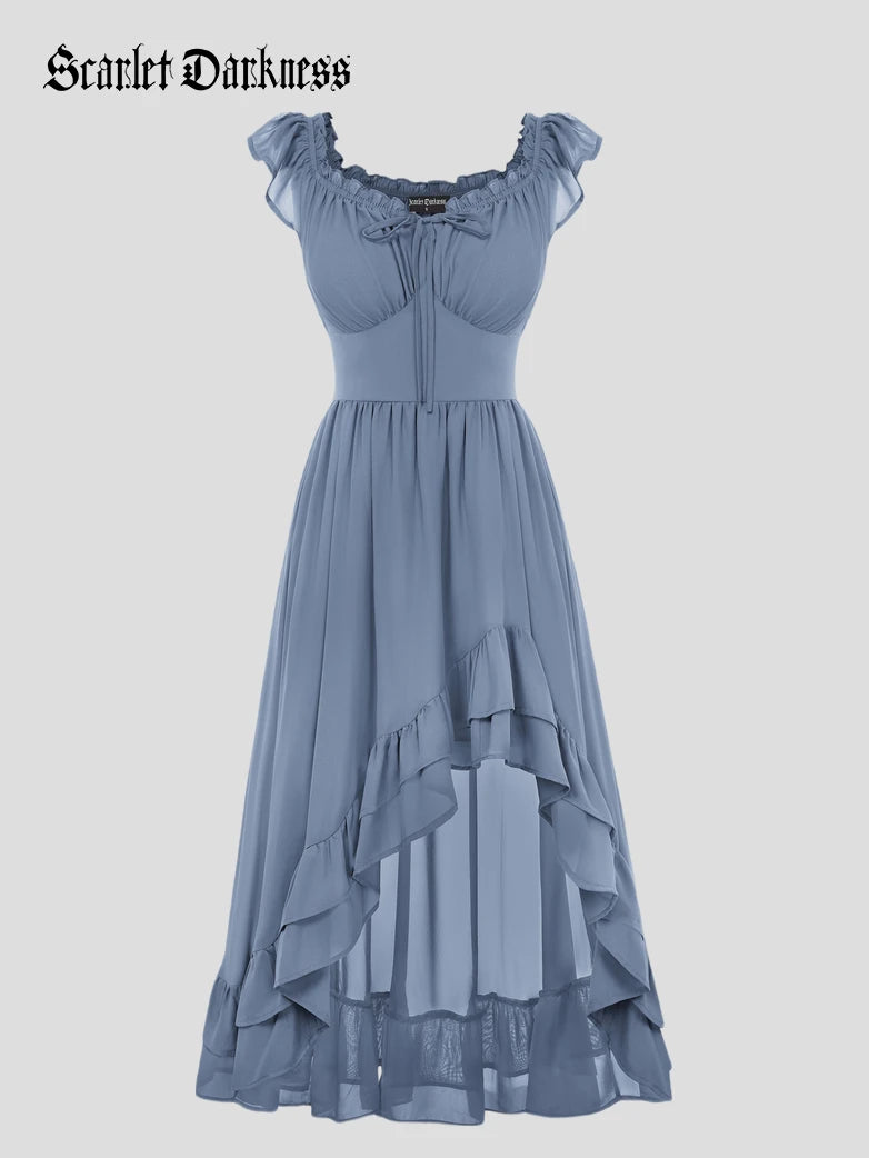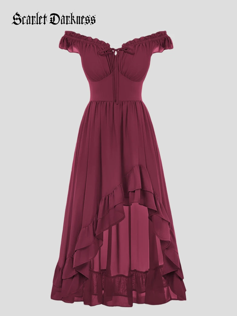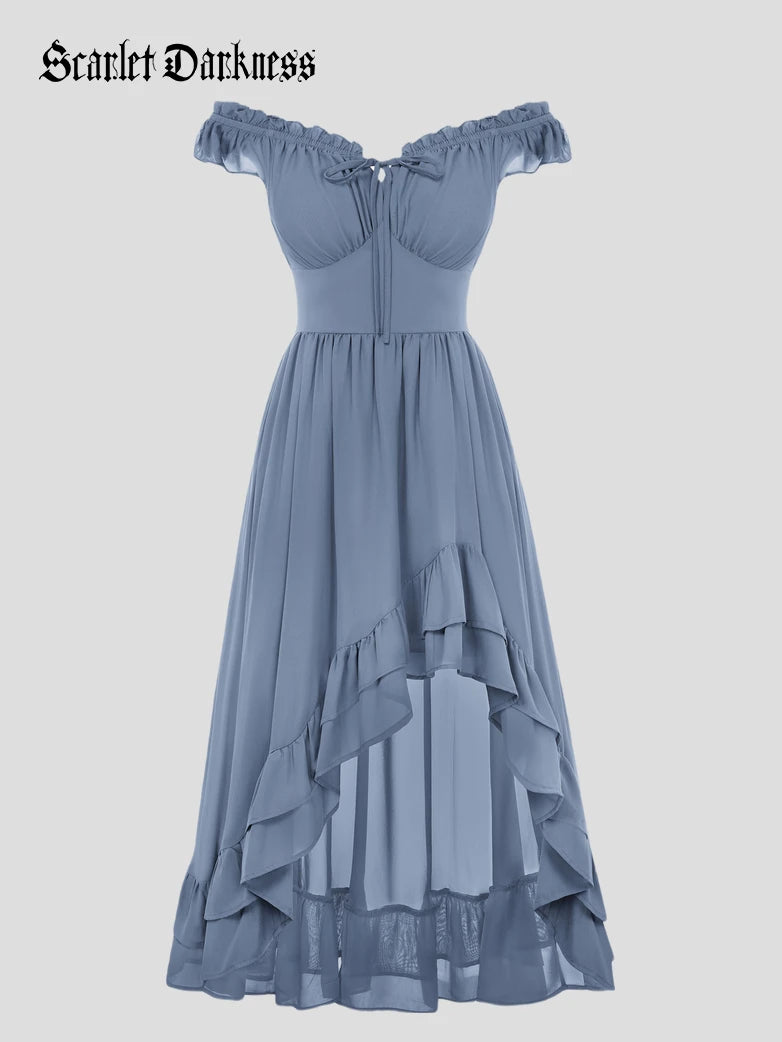 Scarlet Darkness Women Renaissance High-Lo Chiffon Dress Elastic Waist Off Shoulder Pockets Dress