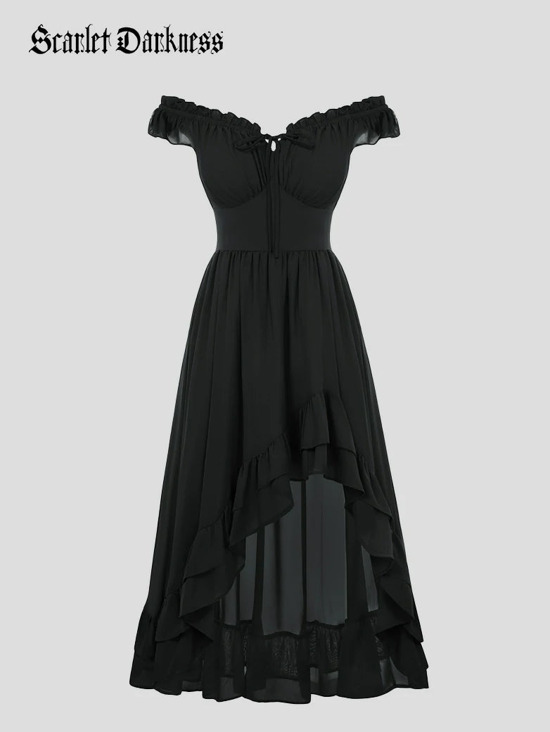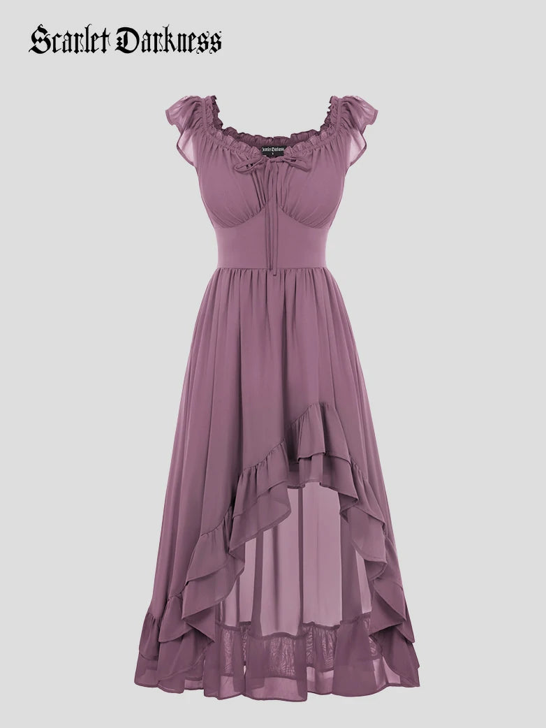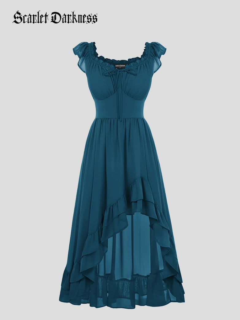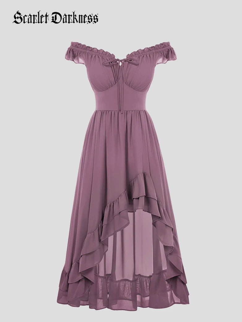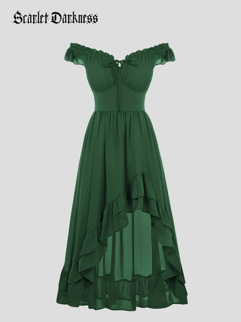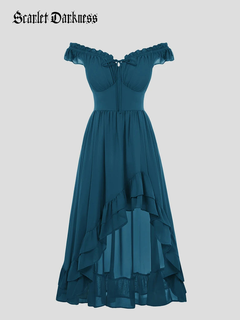 Scarlet Darkness Women Renaissance High-Lo Chiffon Dress Elastic Waist Off Shoulder Pockets Dress