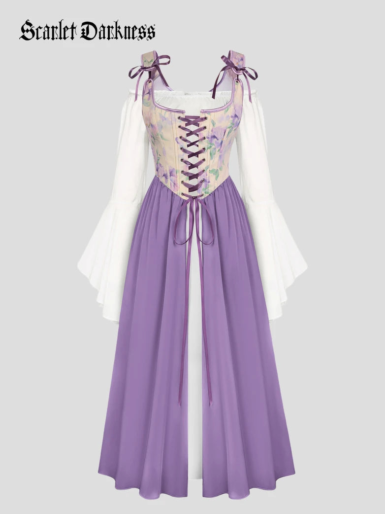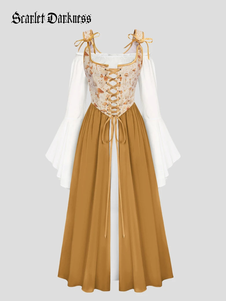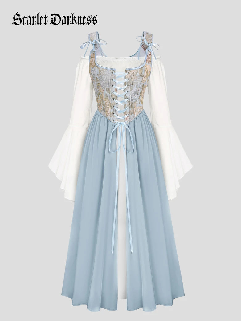 Scarlet Darkness Women Renaissance 2pcs Set Dress Long Sleeve Off Shoulder Dress+Vest Dress
