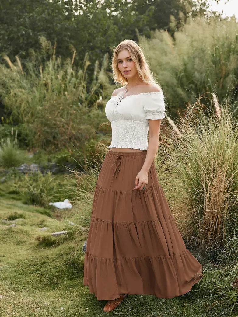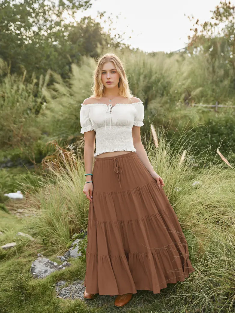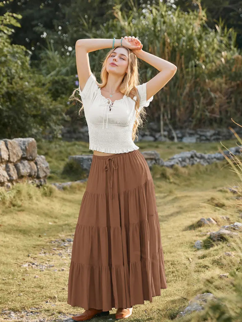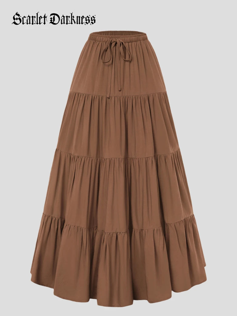 Scarlet Darkness Women Renaissance Drawstring Elastic Waist Tiered Swing Maxi Skirt