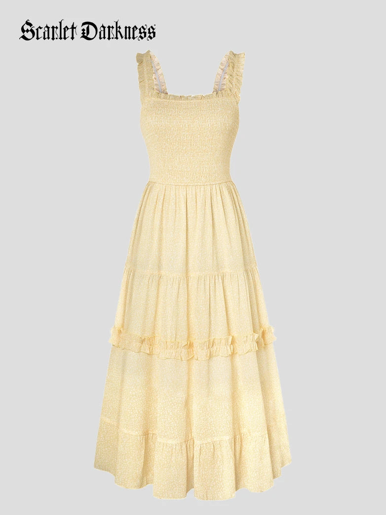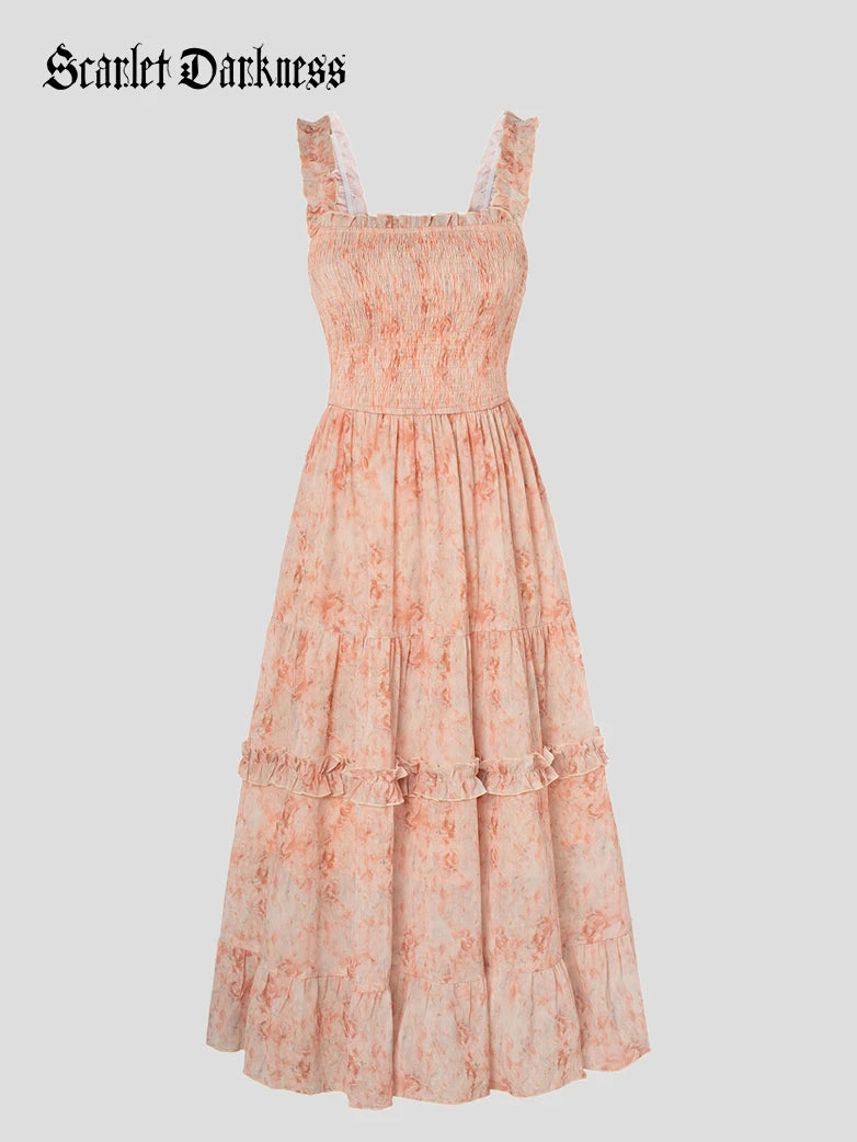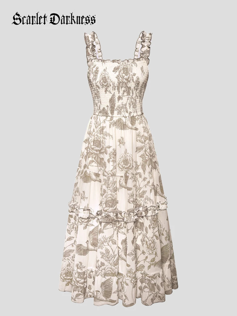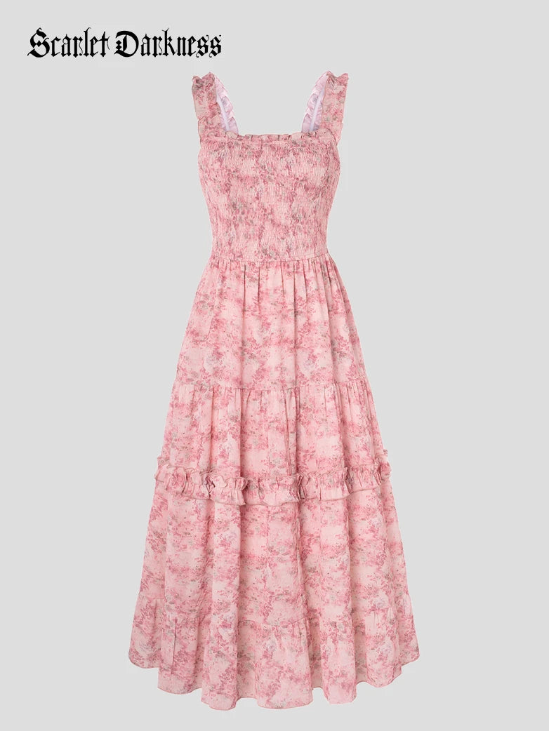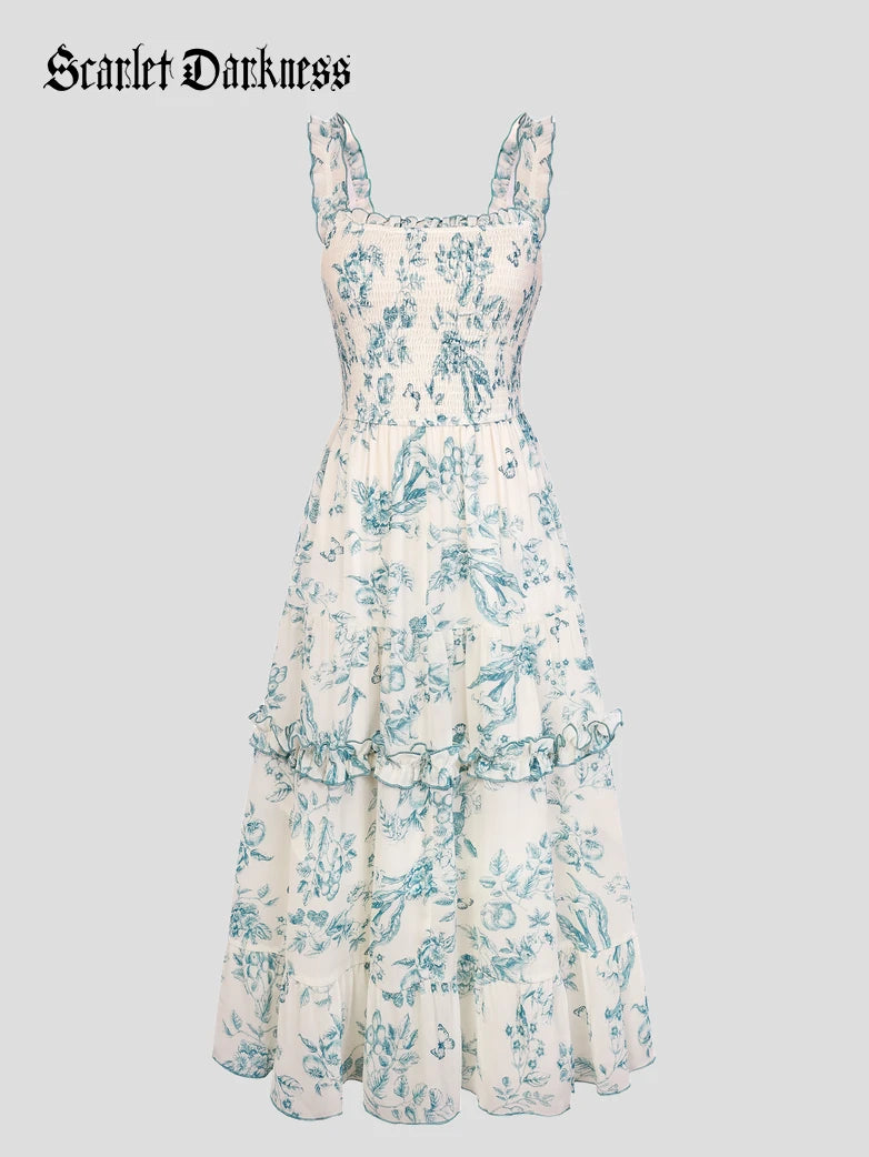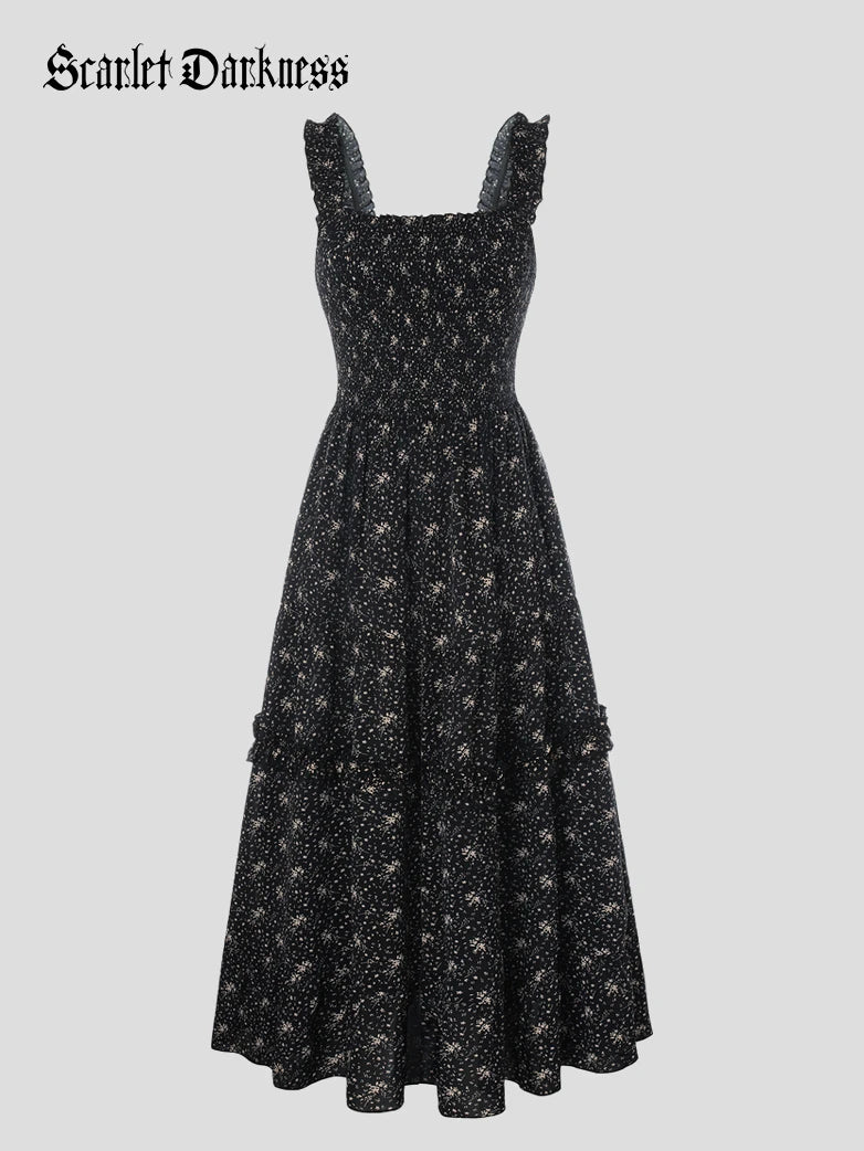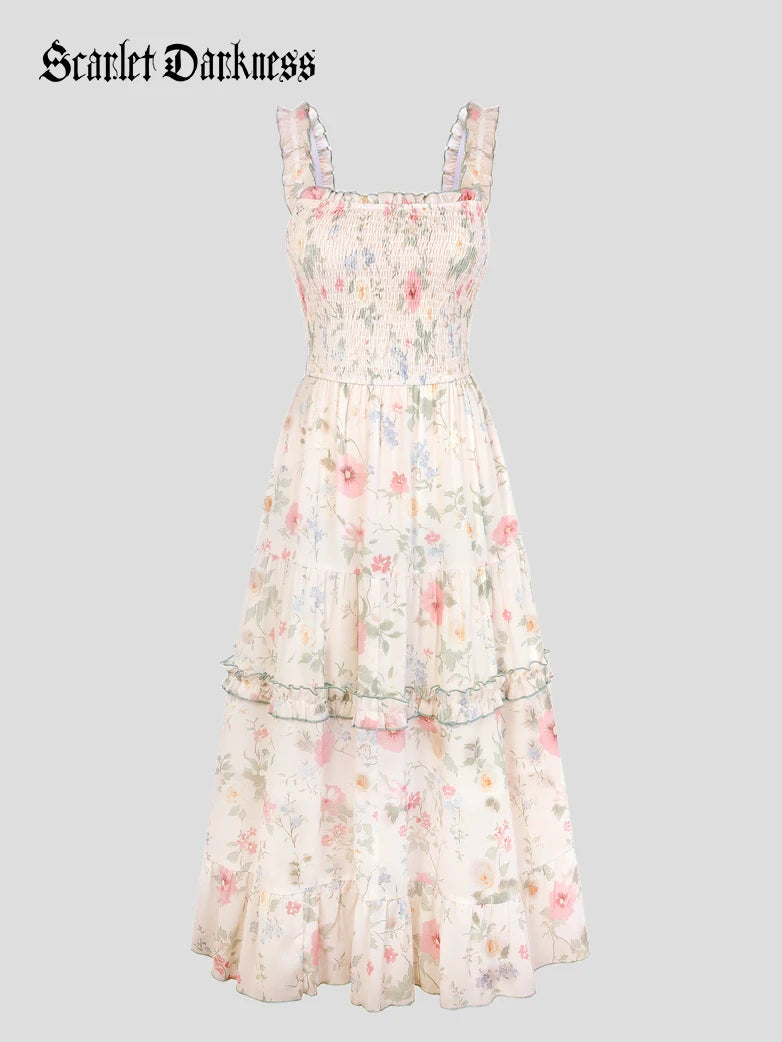 Scarlet Darkness Women Spring Floral Long Elastic Stretch Dress Cottagecore Sundress