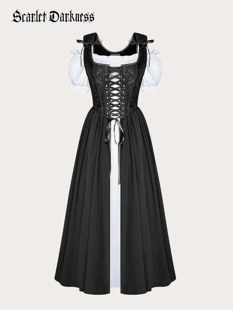 Scarlet Darkness Women Renaissance 2pcs Set Satin Dress Square Neck Vest Dress+Off Shoulder Dress