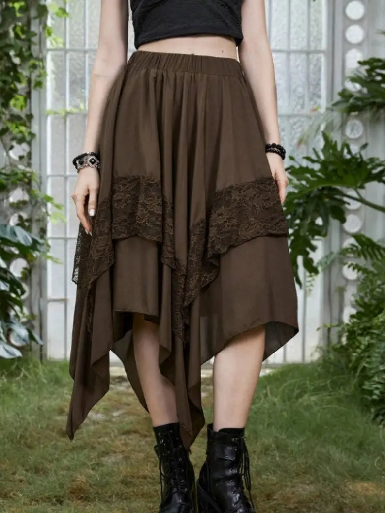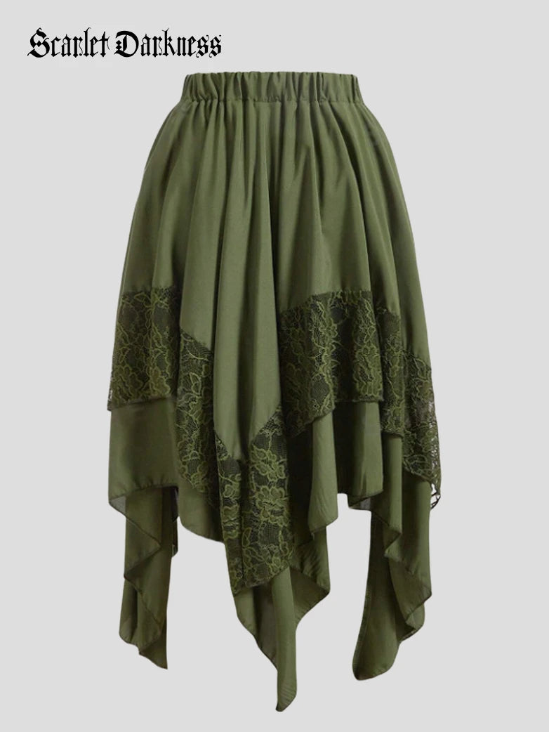 Renaissance Lace Patchwork Irregular Hem Midi Skirt Scarlet Darkness