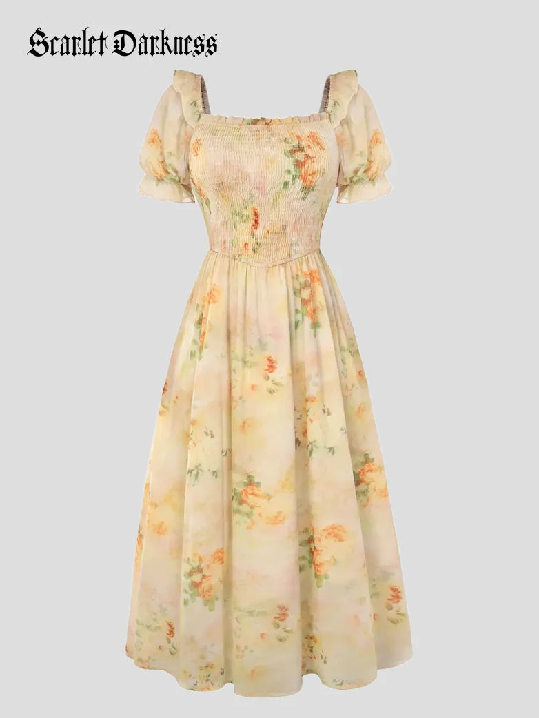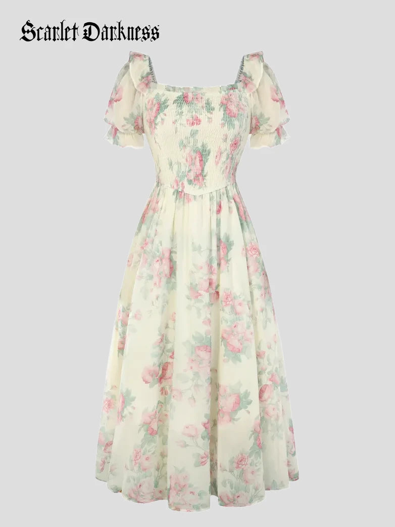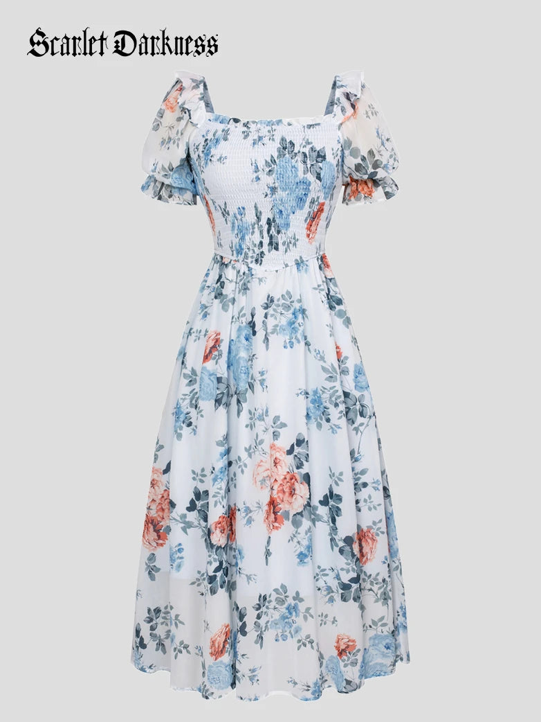 Scarlet Darkness Women Victorian Chiffon Dress Short Sleeve Square Neck Midi A-Line Dress