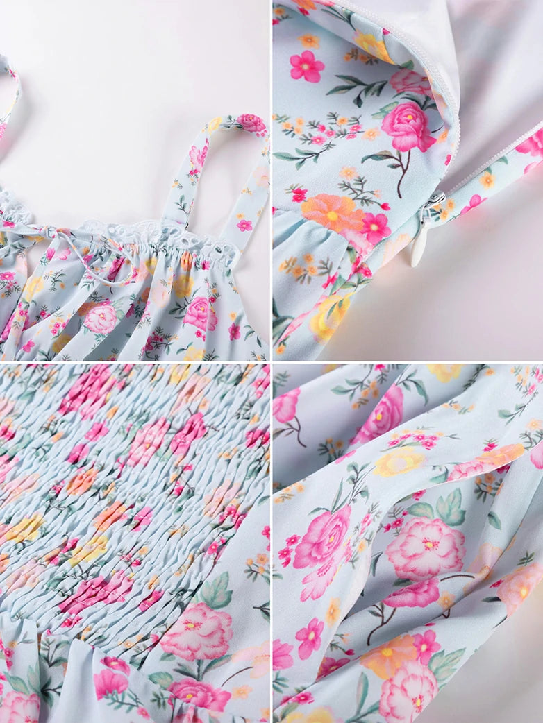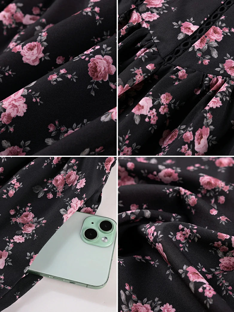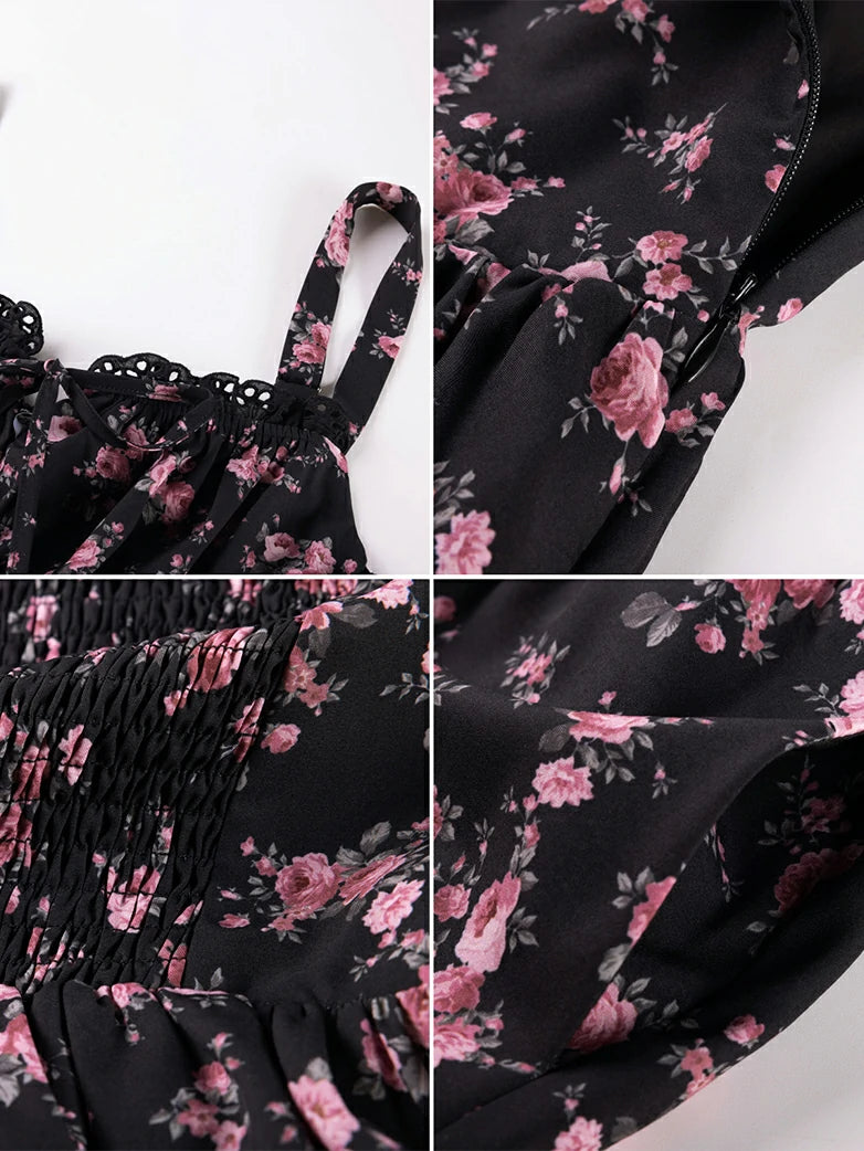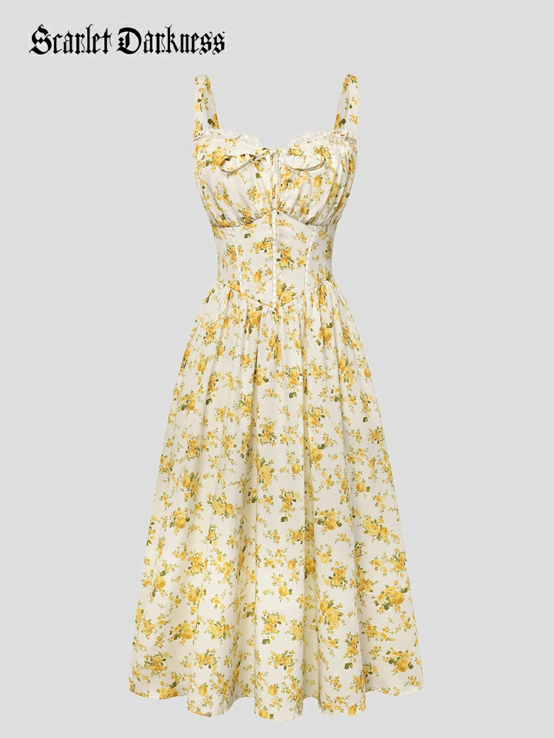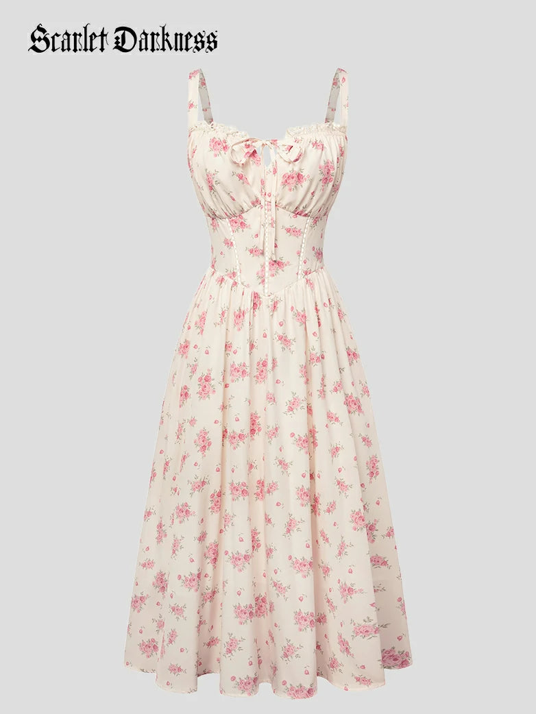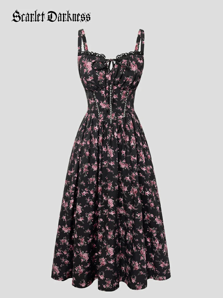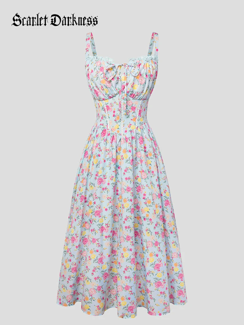 Spring Victorian Floral Corset Milkmaid Dress with Square Neck and Flared A-line Design Scarlet Darkness