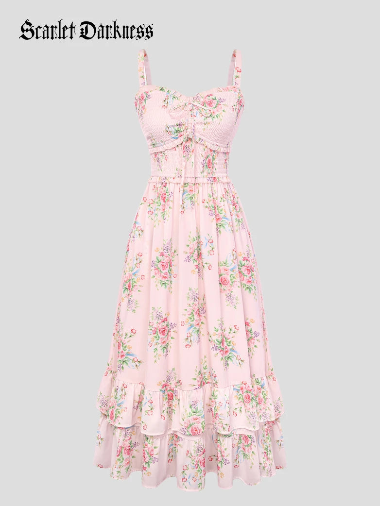 Scarlet Darkness Spring Floral Long Elastic Stretch Dress Cottagecore Dresses for Women with Pockets