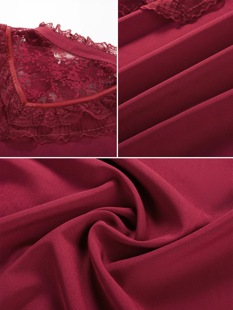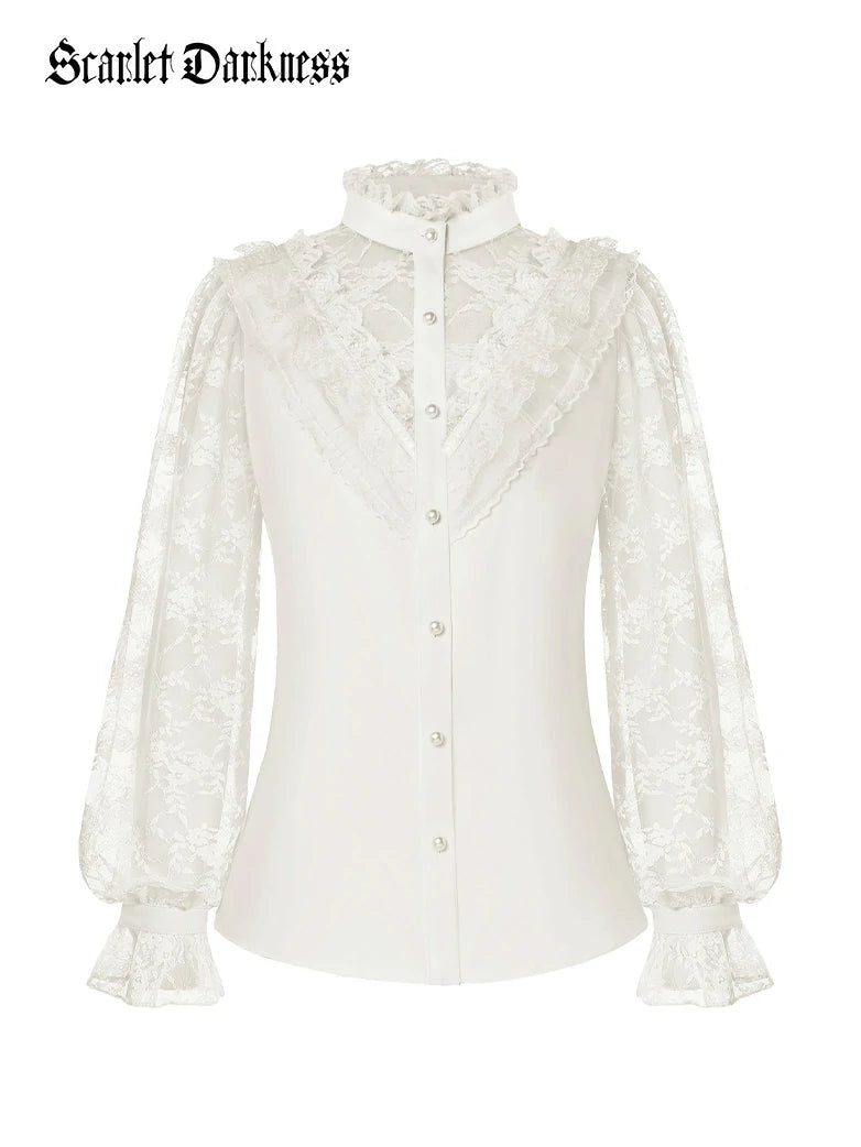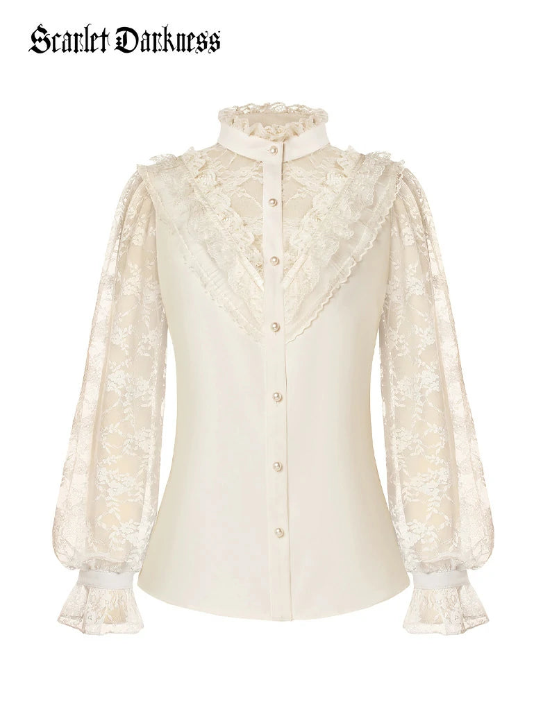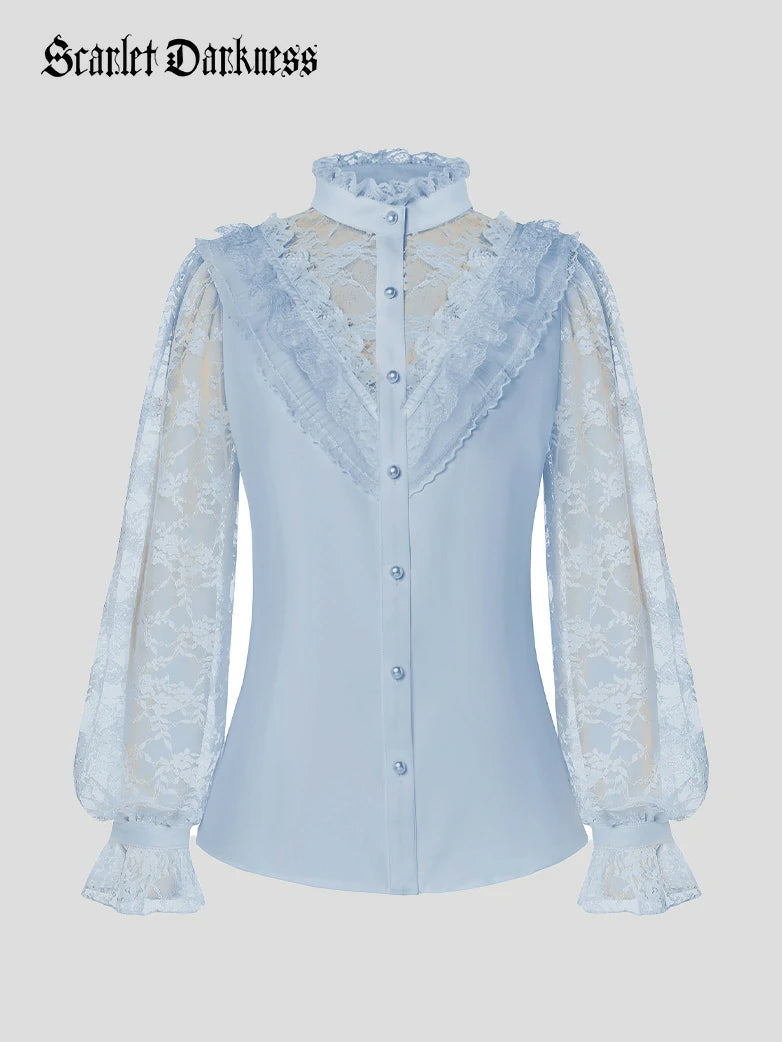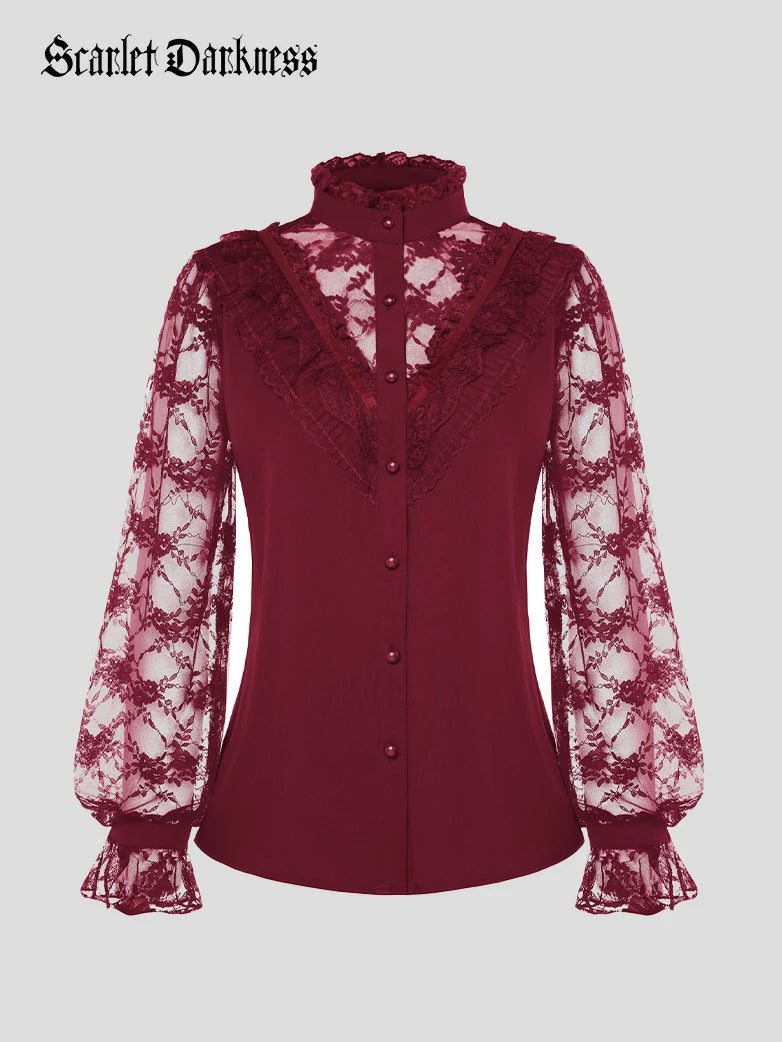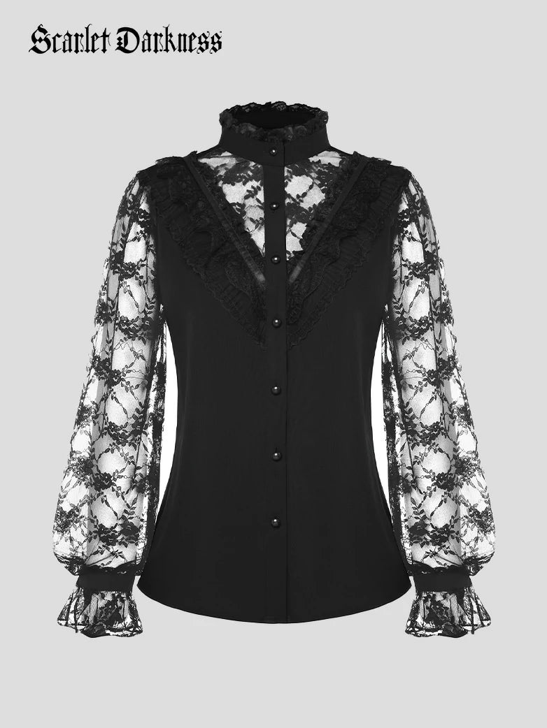 Scarlet Darkness Women Victorian Shirt Lace Patchwork Long Sleeve Stand Collar Tops