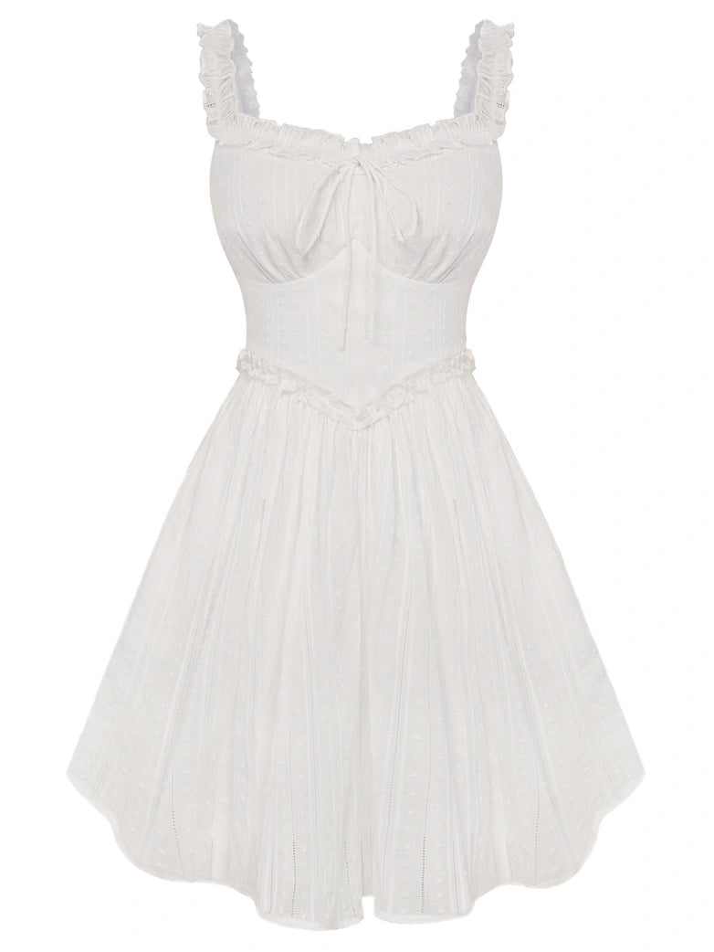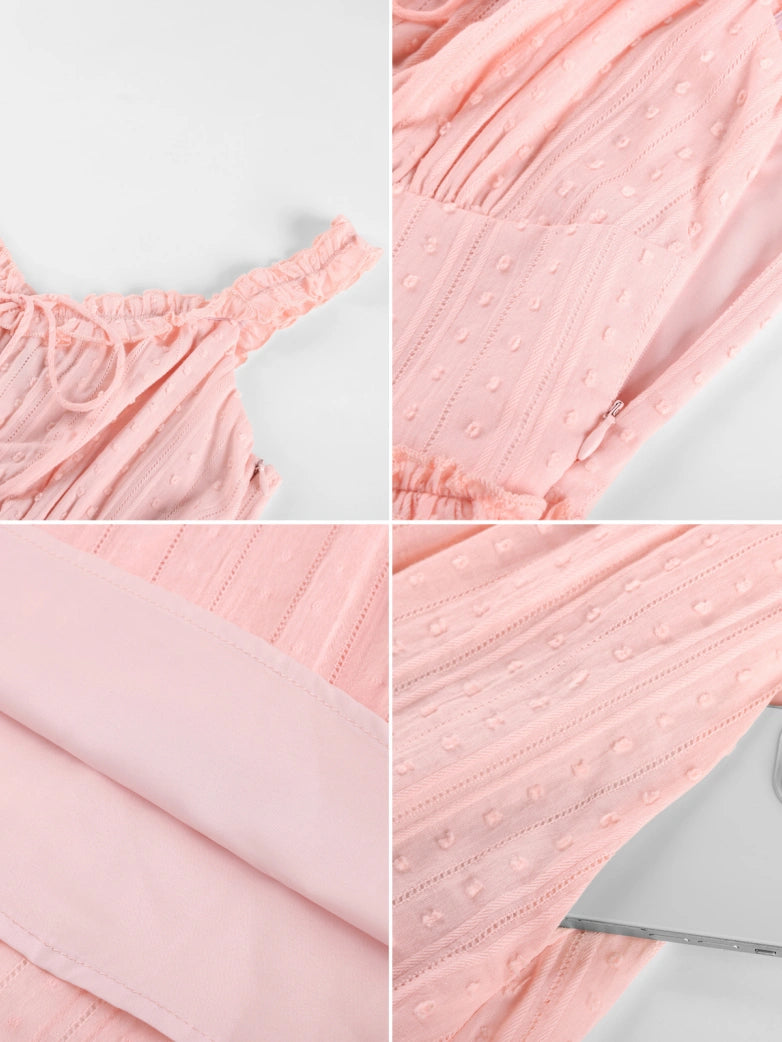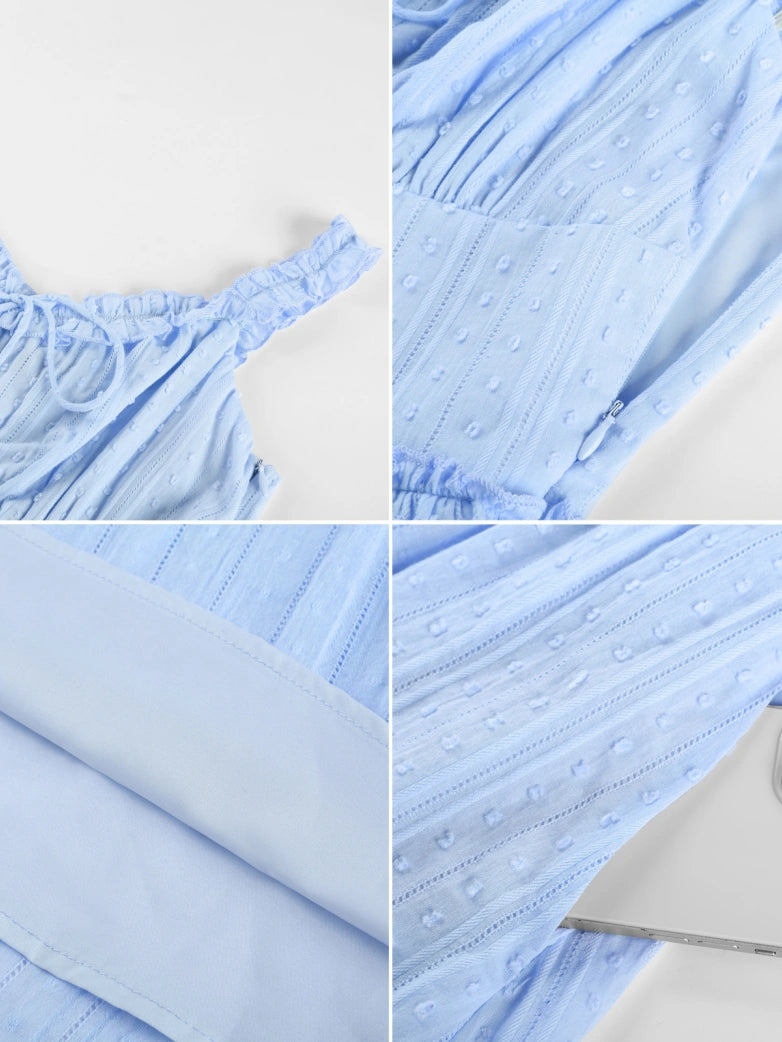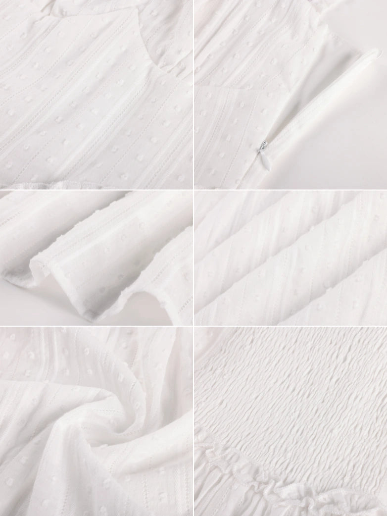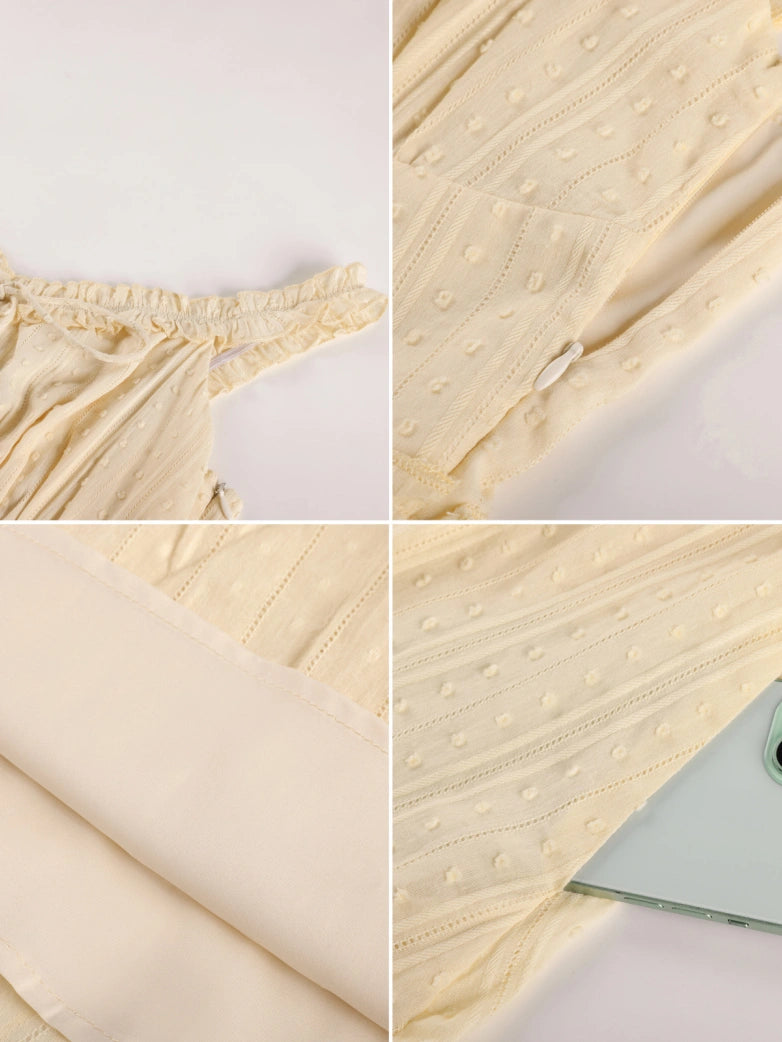Inspired by the Victorian era, the design incorporates delicate polka-dot openwork fabric, ruffles at the neckline and waist, and a fitted waist, replicating the romantic and feminine characteristics of the time and highlighting curves to create a retro and romantic atmosphere.