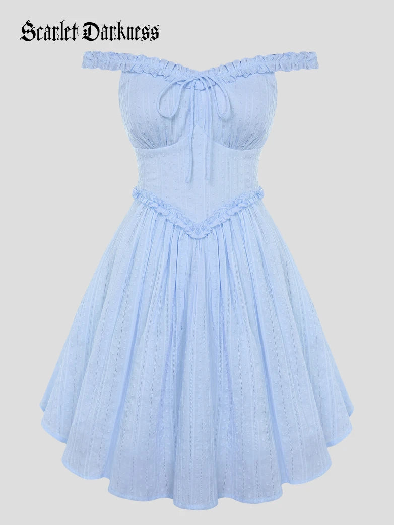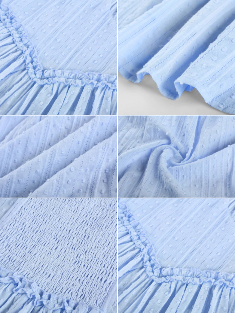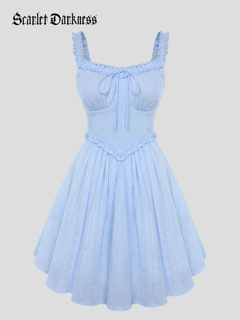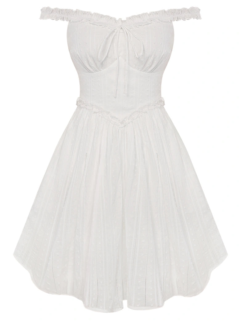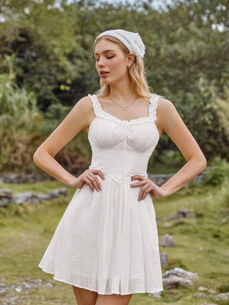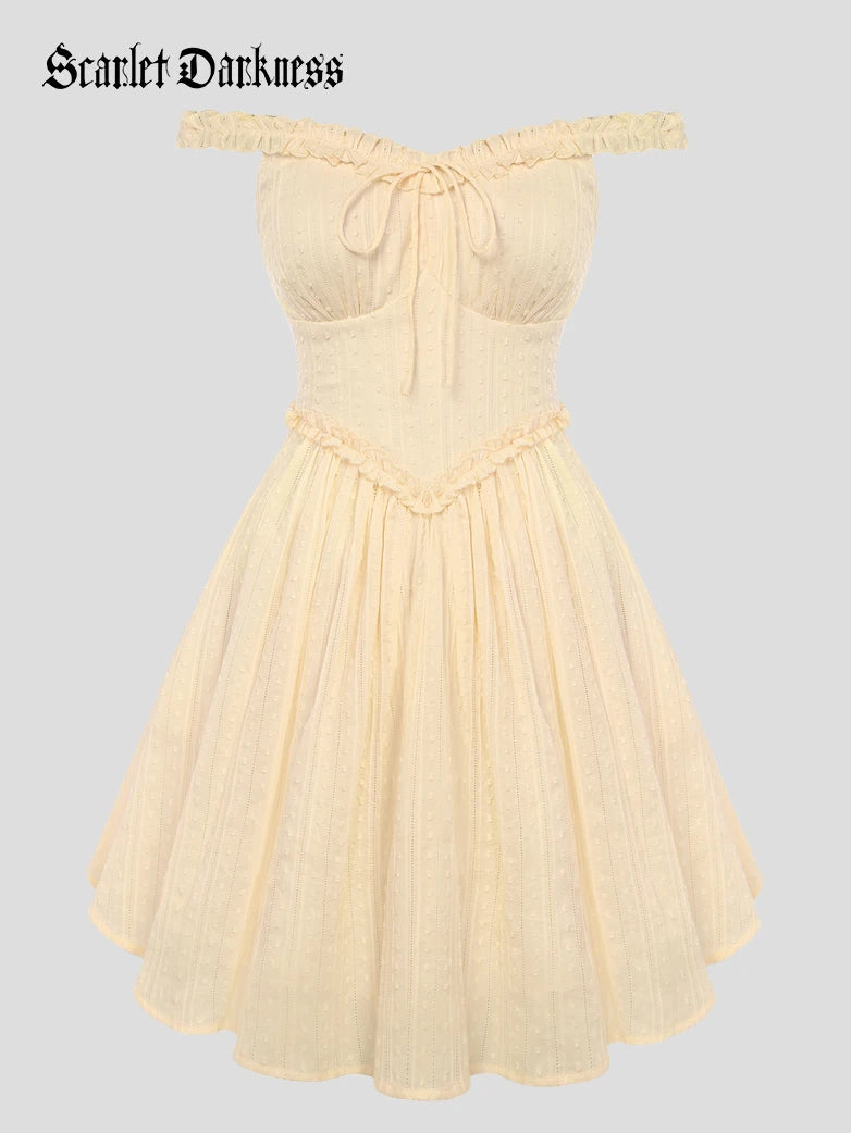 Inspired by the Victorian era, the design incorporates delicate polka-dot openwork fabric, ruffles at the neckline and waist, and a fitted waist, replicating the romantic and feminine characteristics of the time and highlighting curves to create a retro and romantic atmosphere.