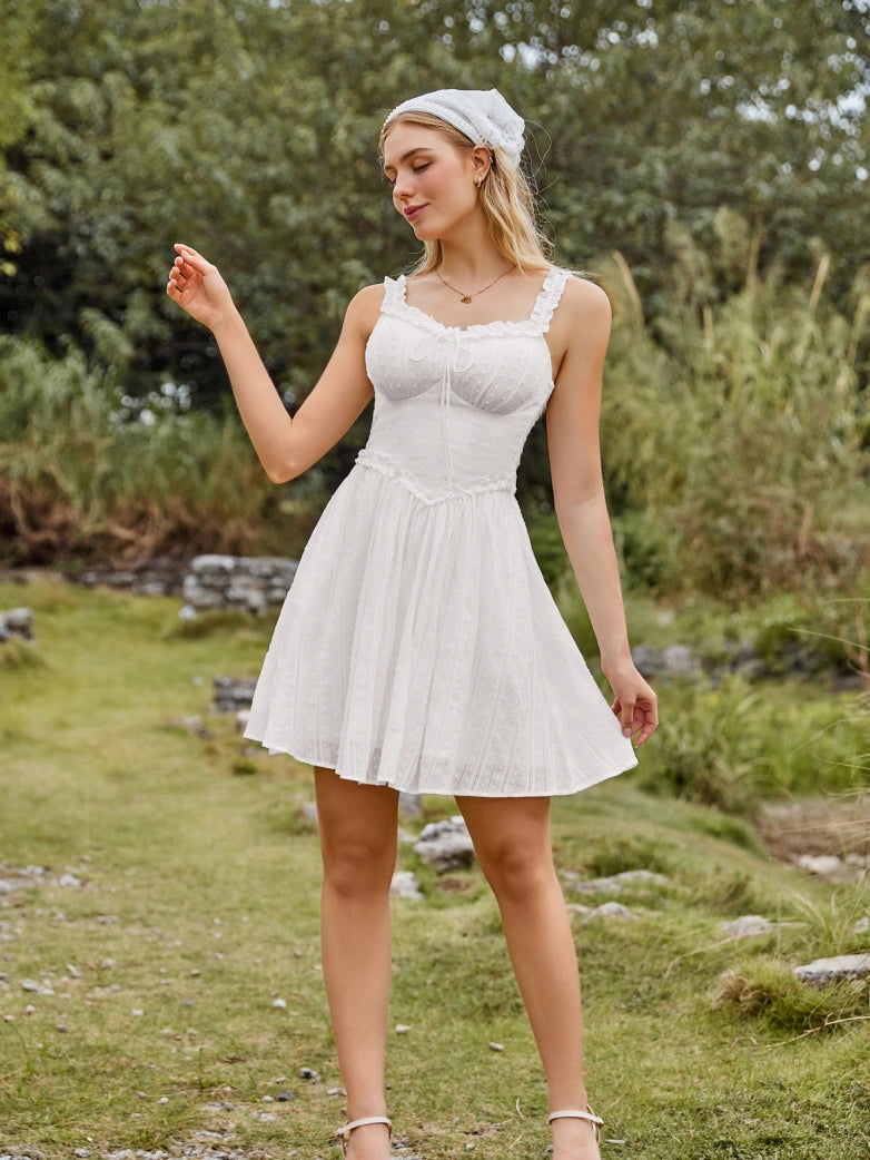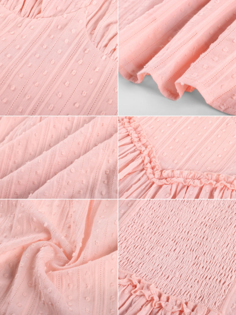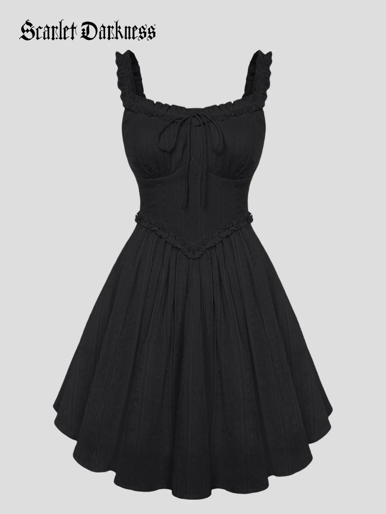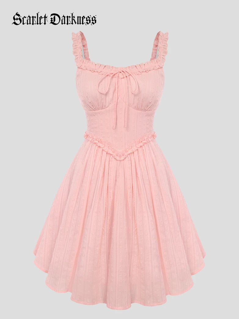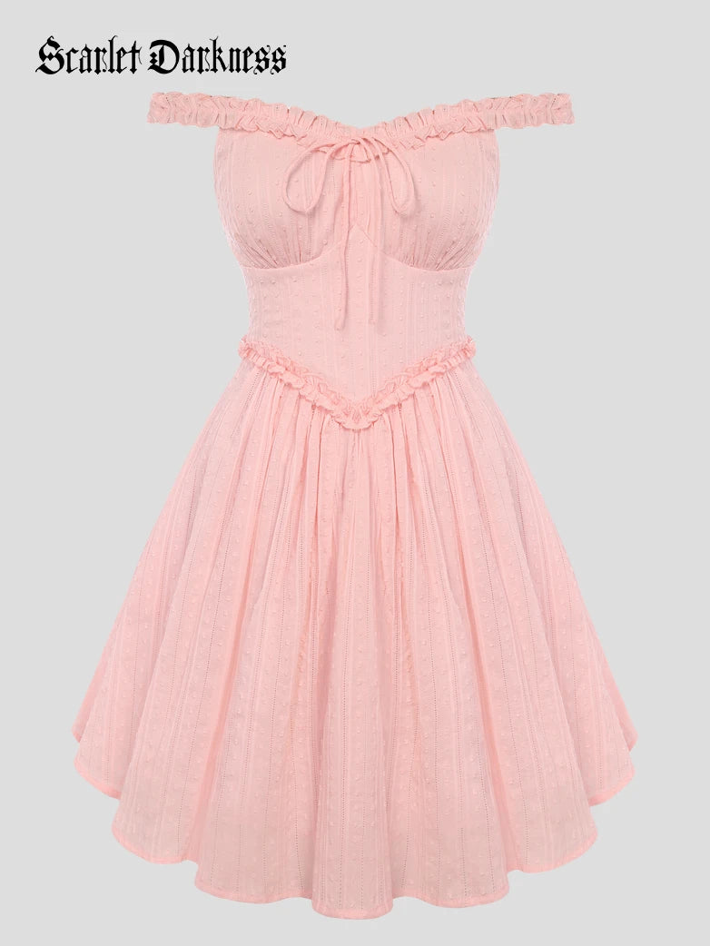 Inspired by the Victorian era, the design incorporates delicate polka-dot openwork fabric, ruffles at the neckline and waist, and a fitted waist, replicating the romantic and feminine characteristics of the time and highlighting curves to create a retro and romantic atmosphere.