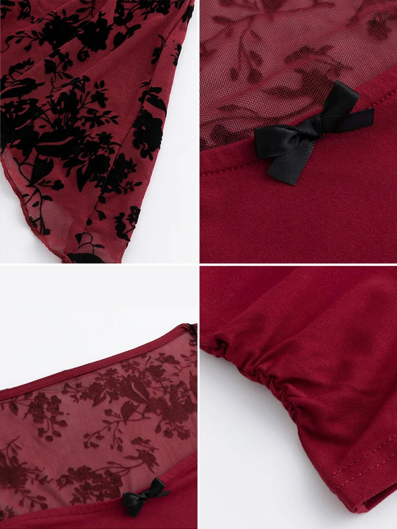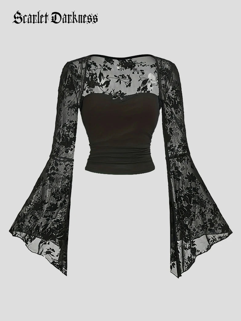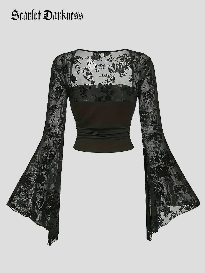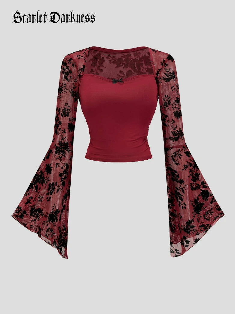 Gothic Vampire Lace Sexy Mesh Back Long-Sleeved Bell-Sleeve Top for Women Scarlet Darkness