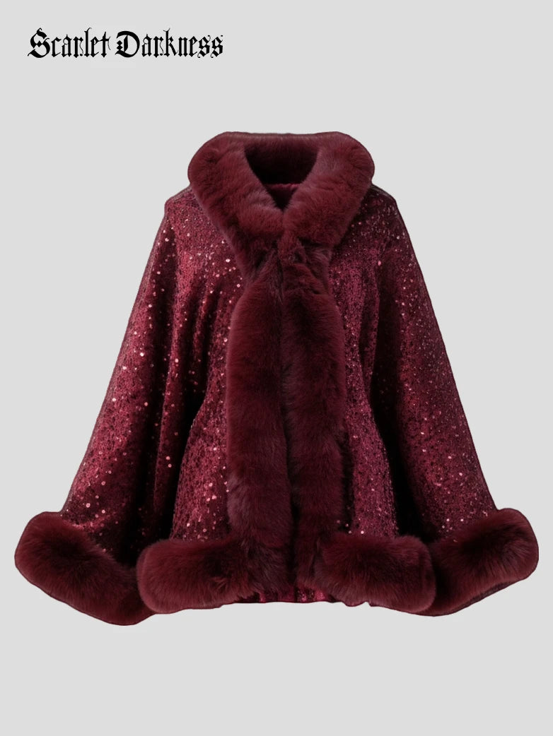 Winter Limited Edition: Thick Fur-Collar Sequined Shawl Coat Scarlet Darkness