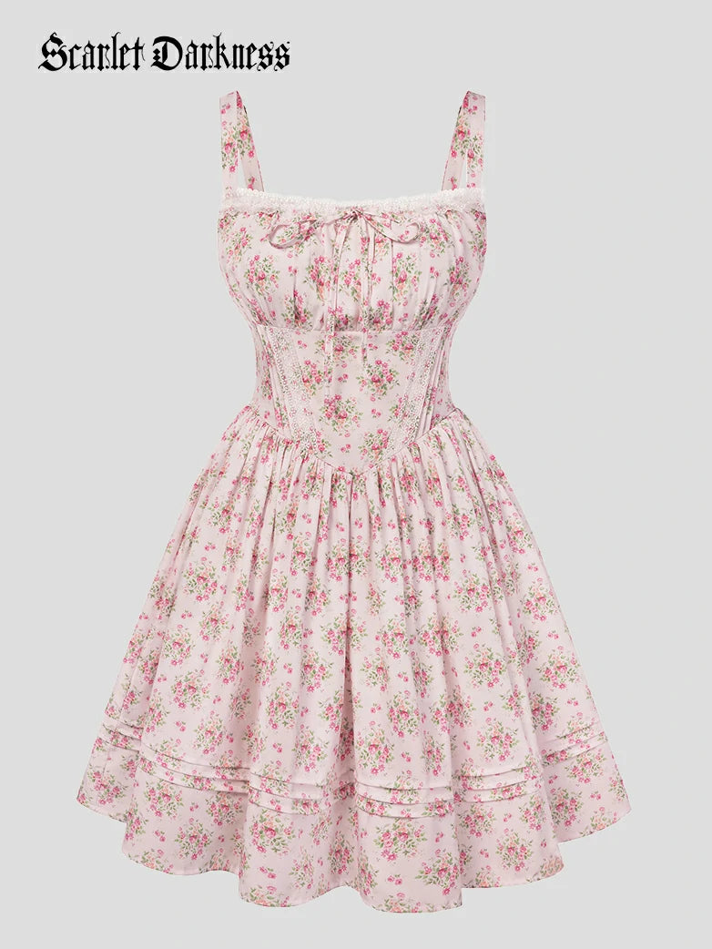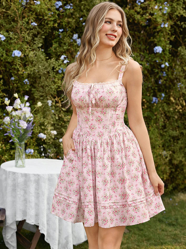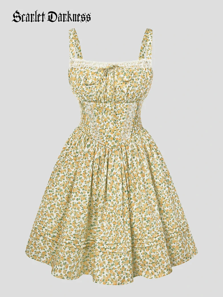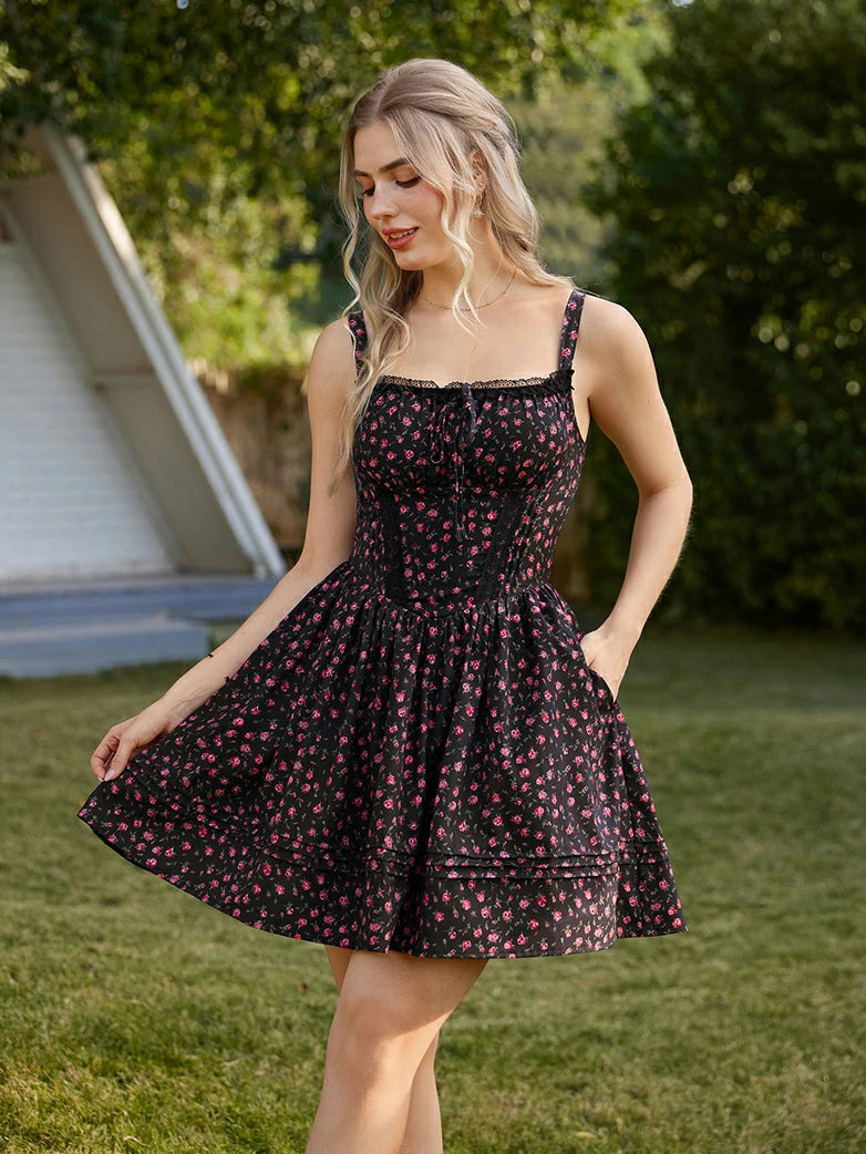 Victorian Puffy Corset Dress Sundress with Pockets