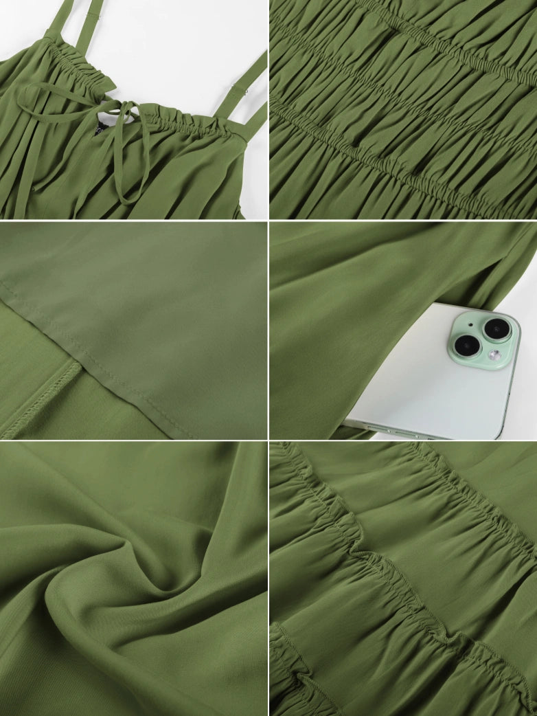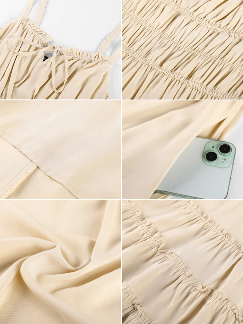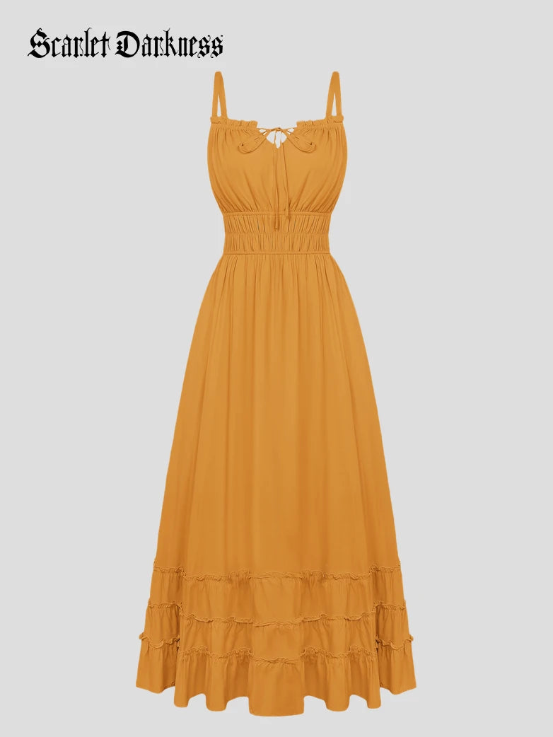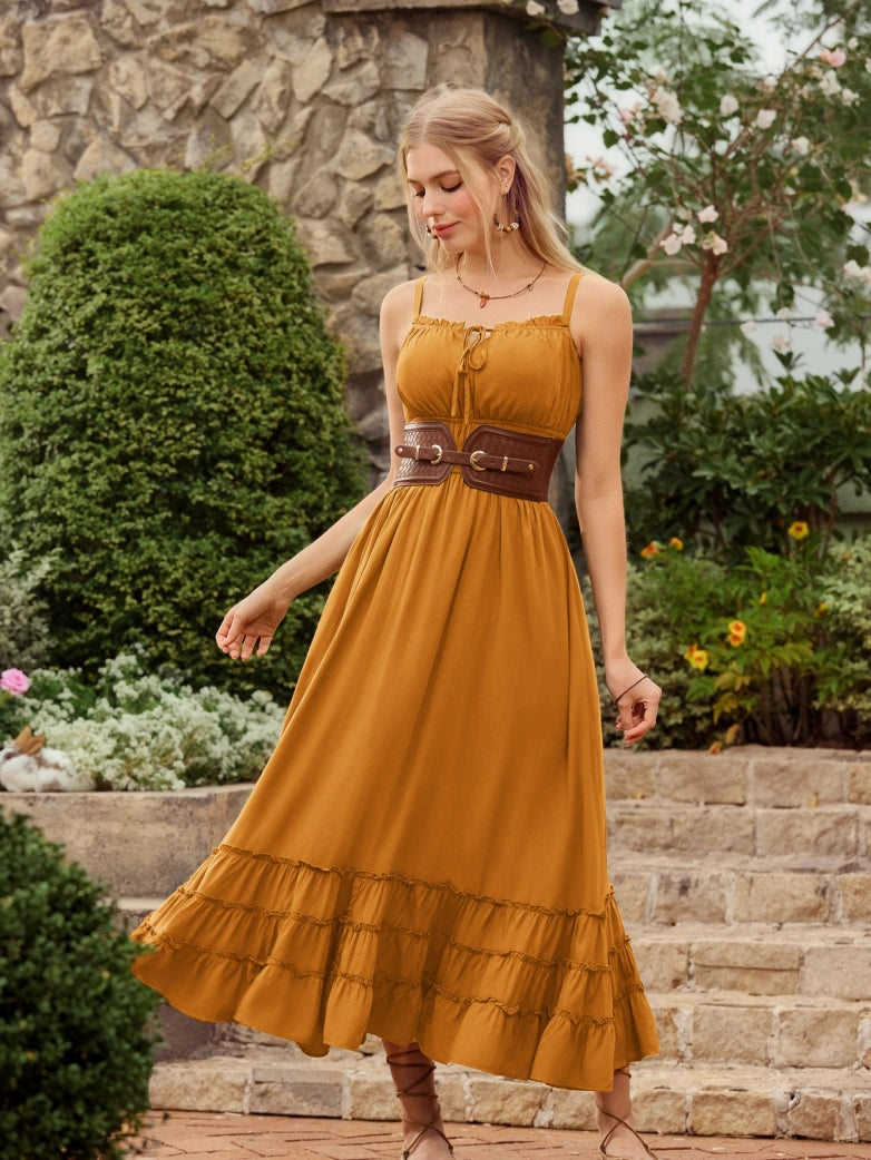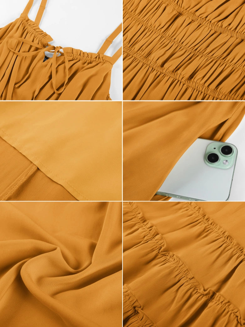 Extracting the free-spirited soul of Bohemian style: the warm ginger yellow hue, like the sunset over the Sahara Desert, conveys a passionate and carefree atmosphere; the halter design and chest tie replicate the Gypsy's pursuit of freedom of movement, showcasing an unrestrained romance;