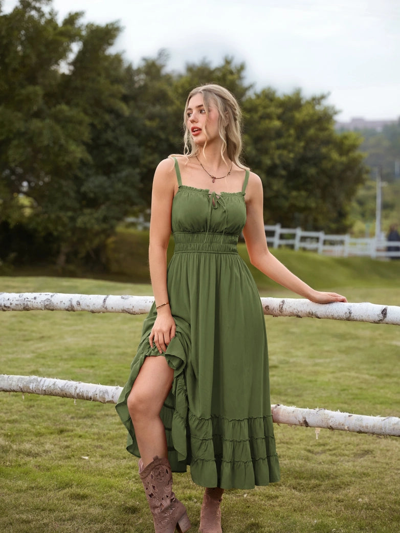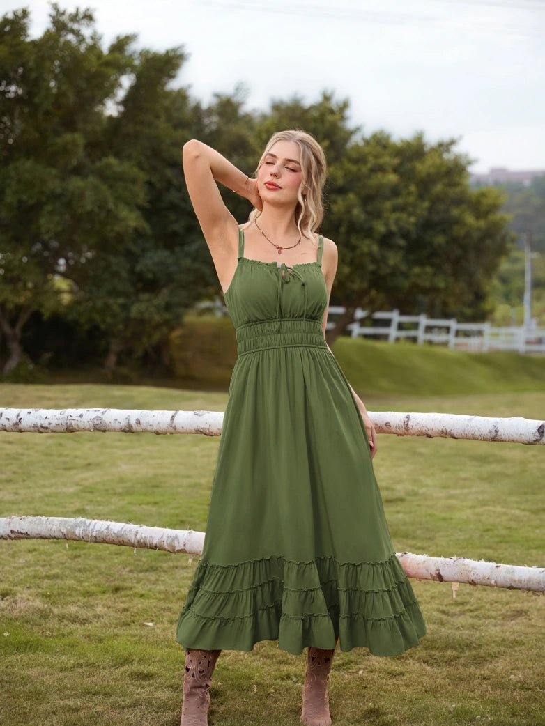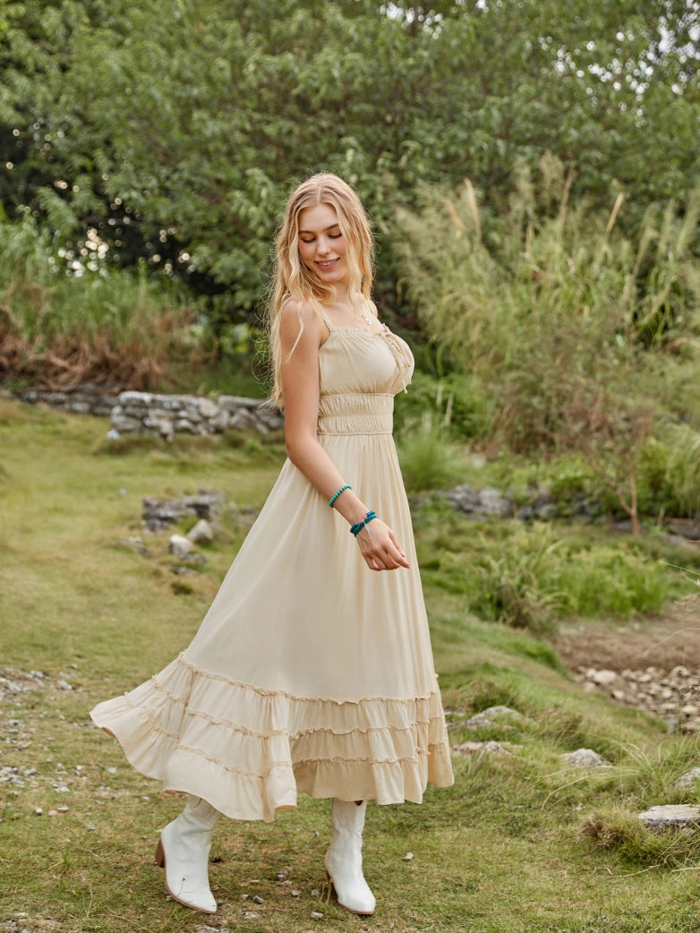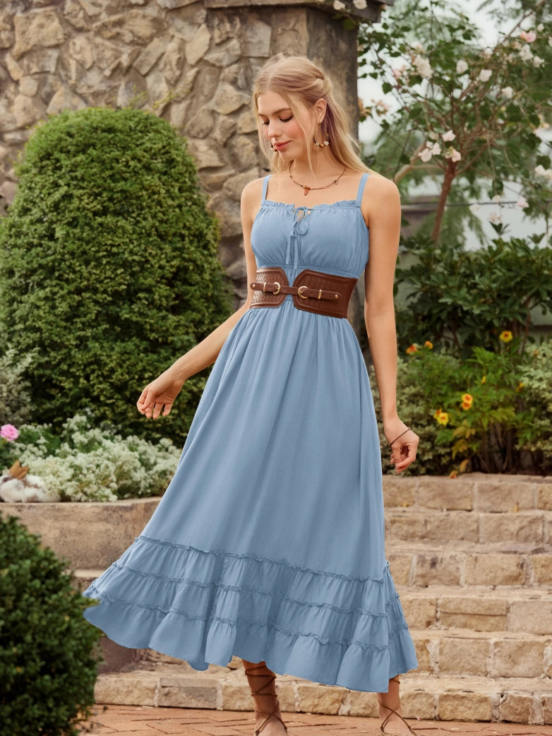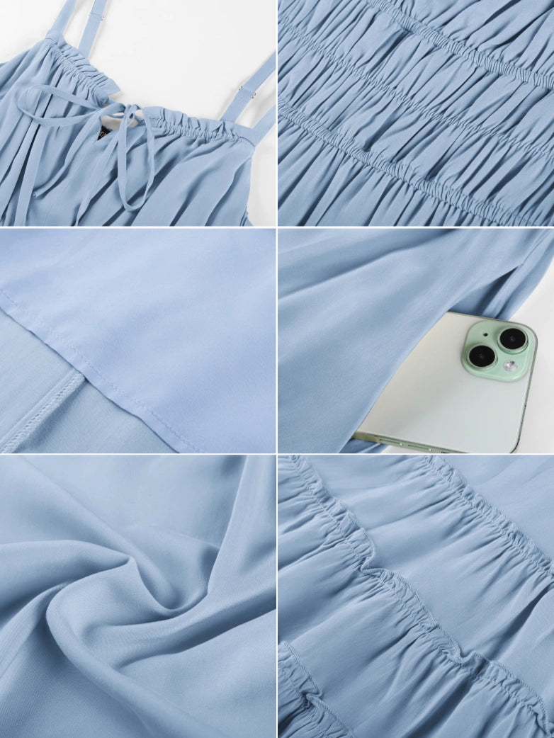 Extracting the free-spirited soul of Bohemian style: the warm ginger yellow hue, like the sunset over the Sahara Desert, conveys a passionate and carefree atmosphere; the halter design and chest tie replicate the Gypsy's pursuit of freedom of movement, showcasing an unrestrained romance;