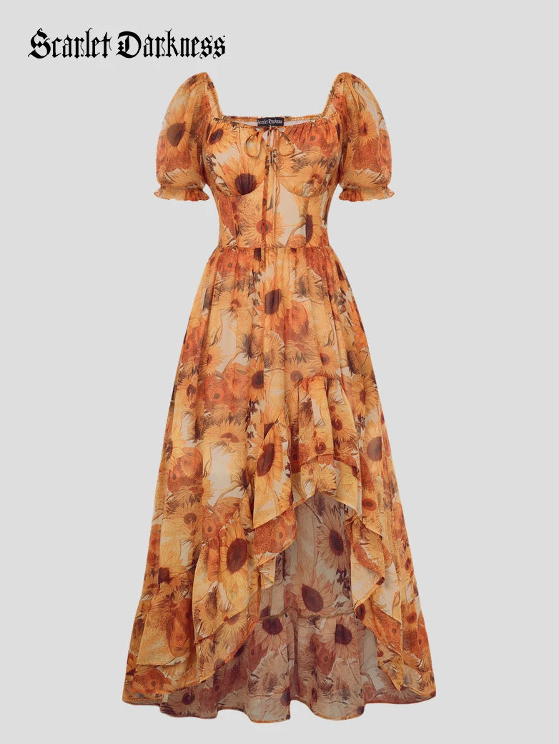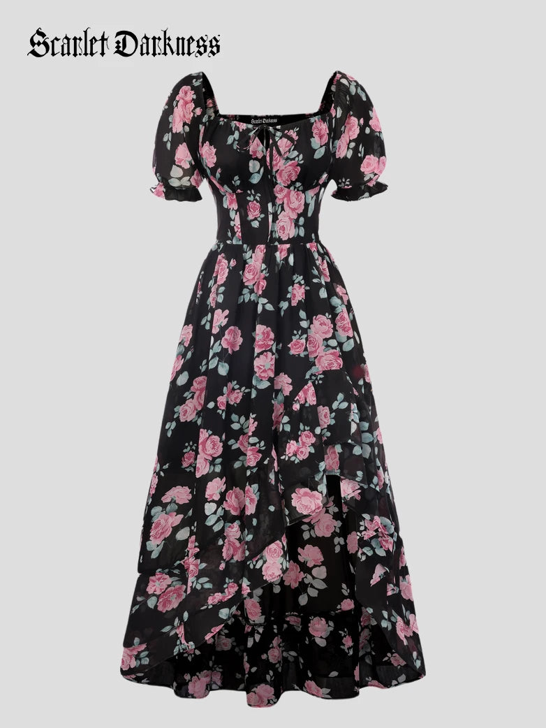 Add some drama to your wardrobe with Scarlet Darkness's Victorian Irregular Hem Puffy Dress. The unique hemline and puffy sleeves exude a playful vintage vibe. Perfect for making a statement at any event, this dress is bound to turn heads and showcase your fun, quirky style.