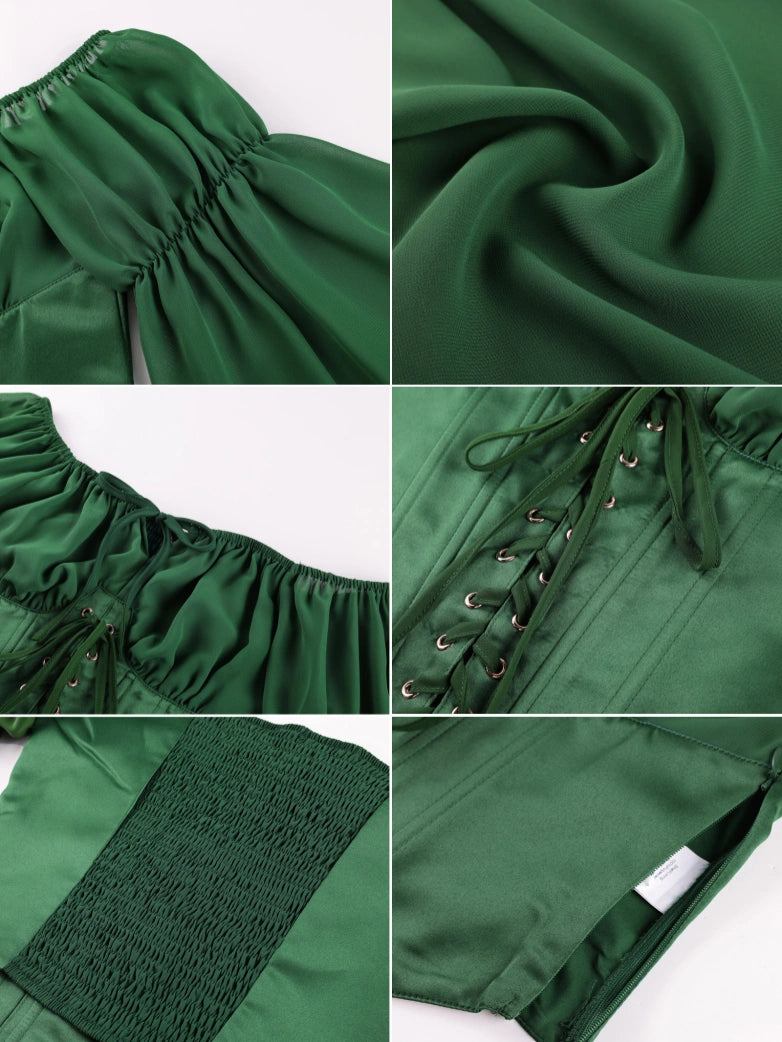 The "cinched-waist apron hem" from the painting is transformed into a cinched-waist ruffled hem, and the "wide-sleeved, wrist-binding" overcoat is modified into lantern sleeves, paired with a modern off-the-shoulder design.