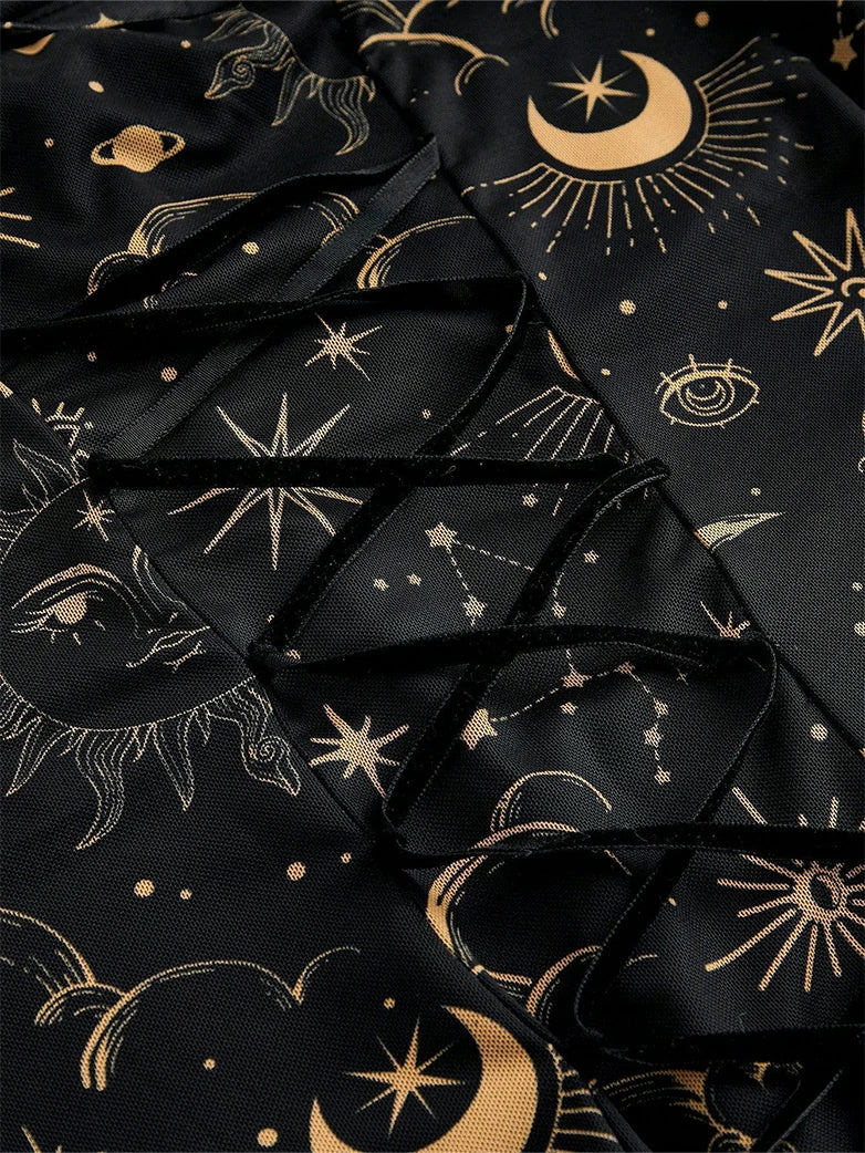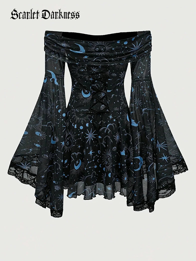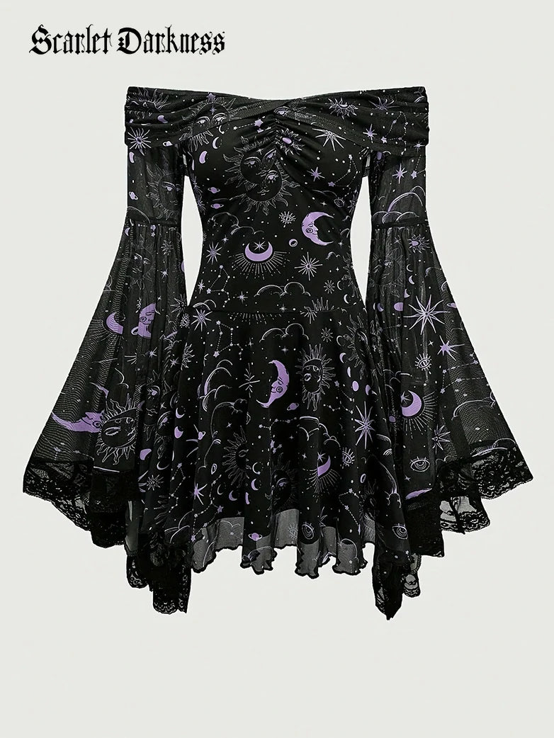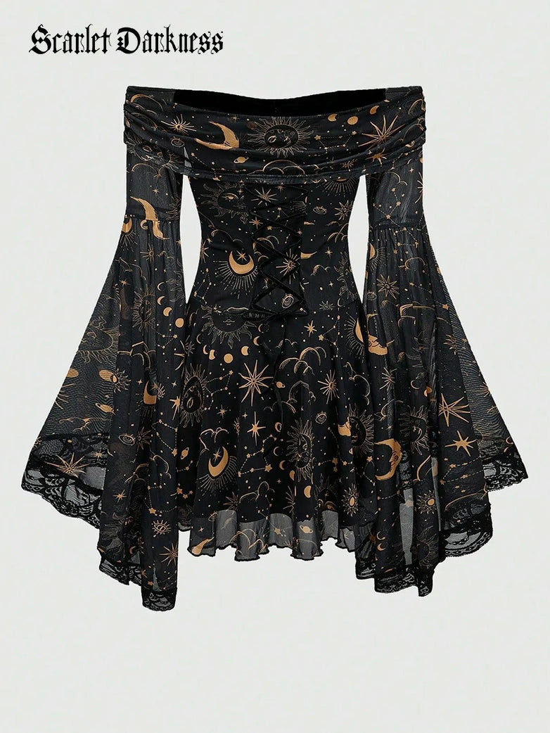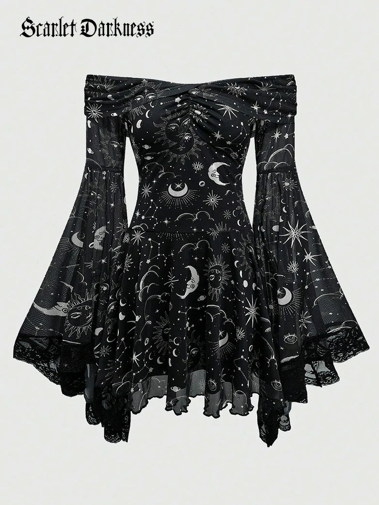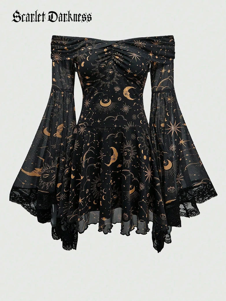 Women's Gothic Whimsical Print Off-the-Shoulder Bell Sleeve Mesh Dress