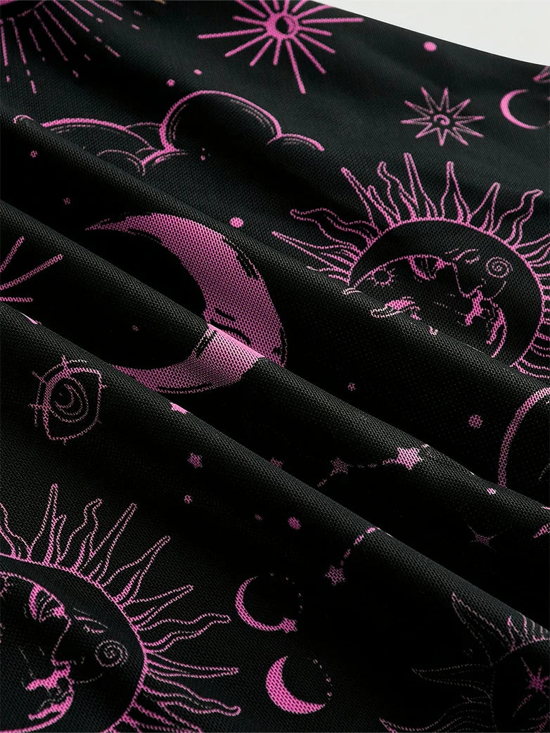 Step into whimsical darkness with the Women's Gothic Whimsical Print Off-the-Shoulder Bell Sleeve Mesh Dress.