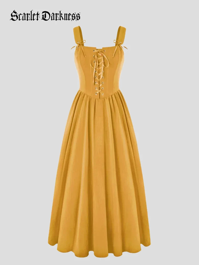 Scarlet Darkness Women Renaissance Maxi Dress Wide Shoulder Straps Lace-up Bodice Flared A-Line Dress