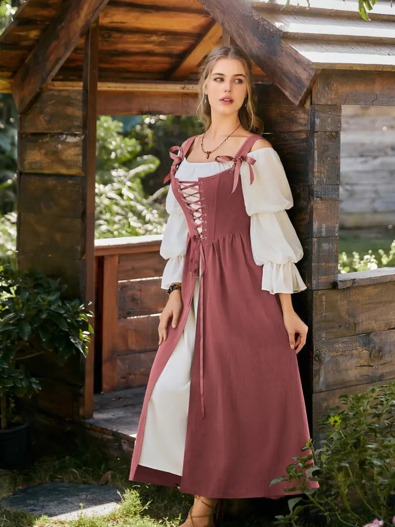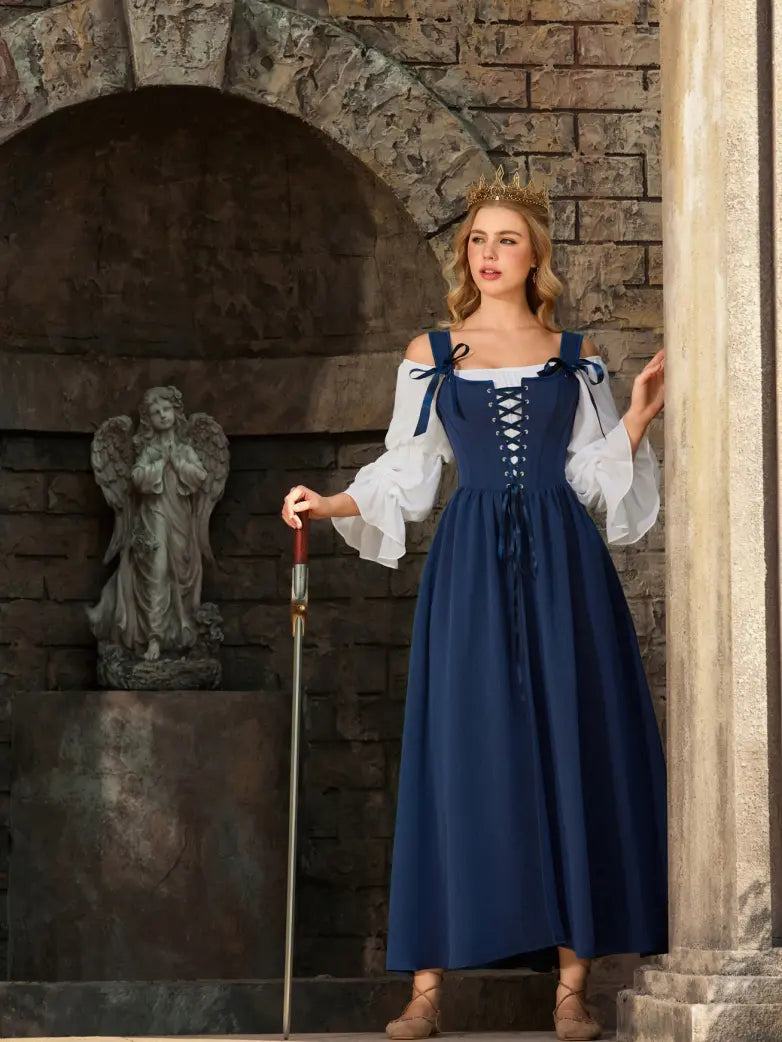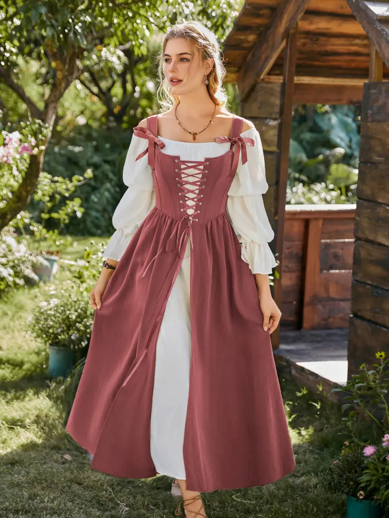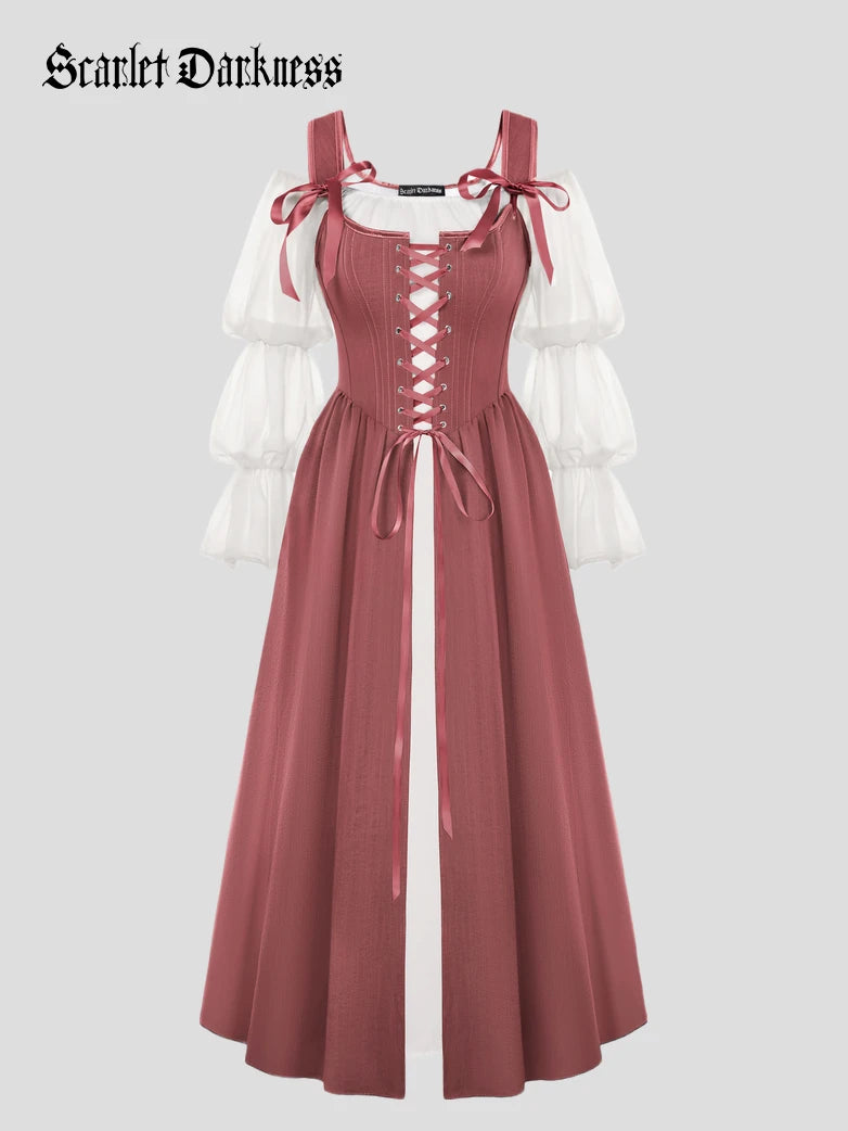 Scarlet Darkness Women Renaissance 2pcs Set Costume Off Shoulder Inner Dress+Vest Dress
