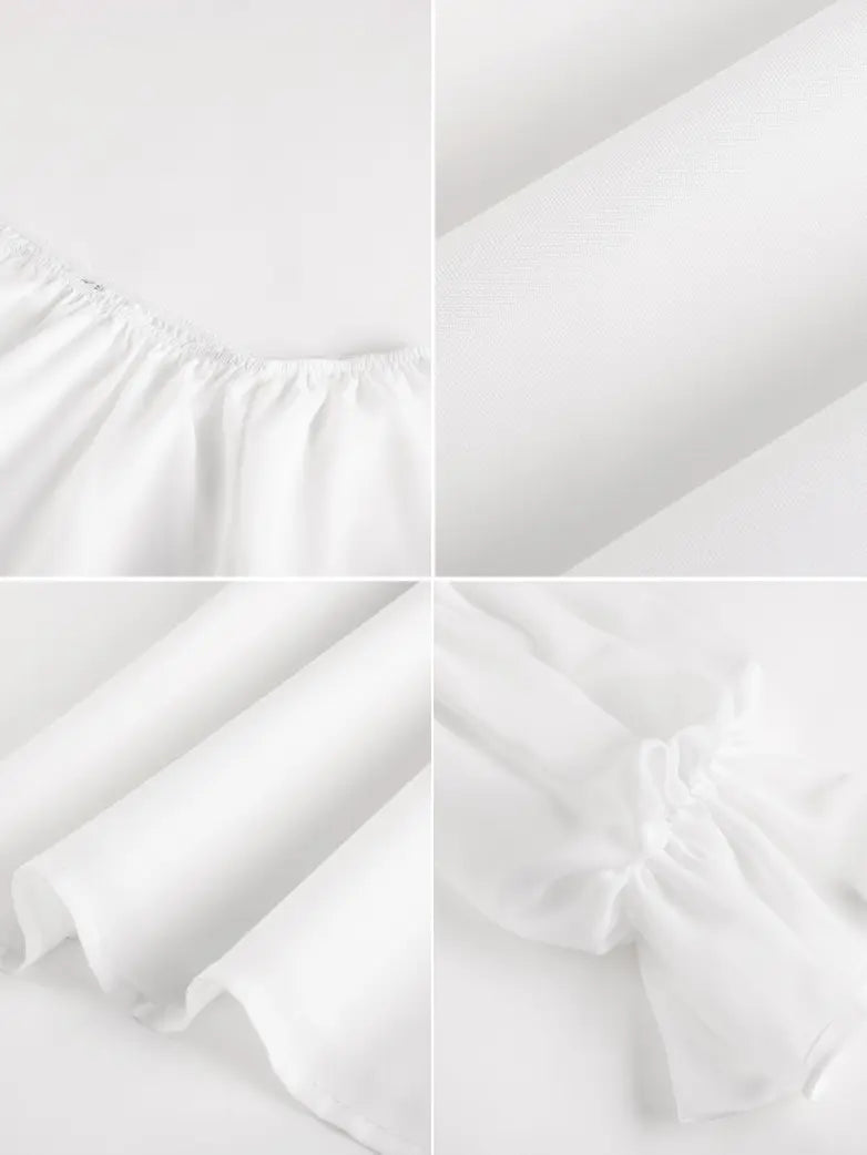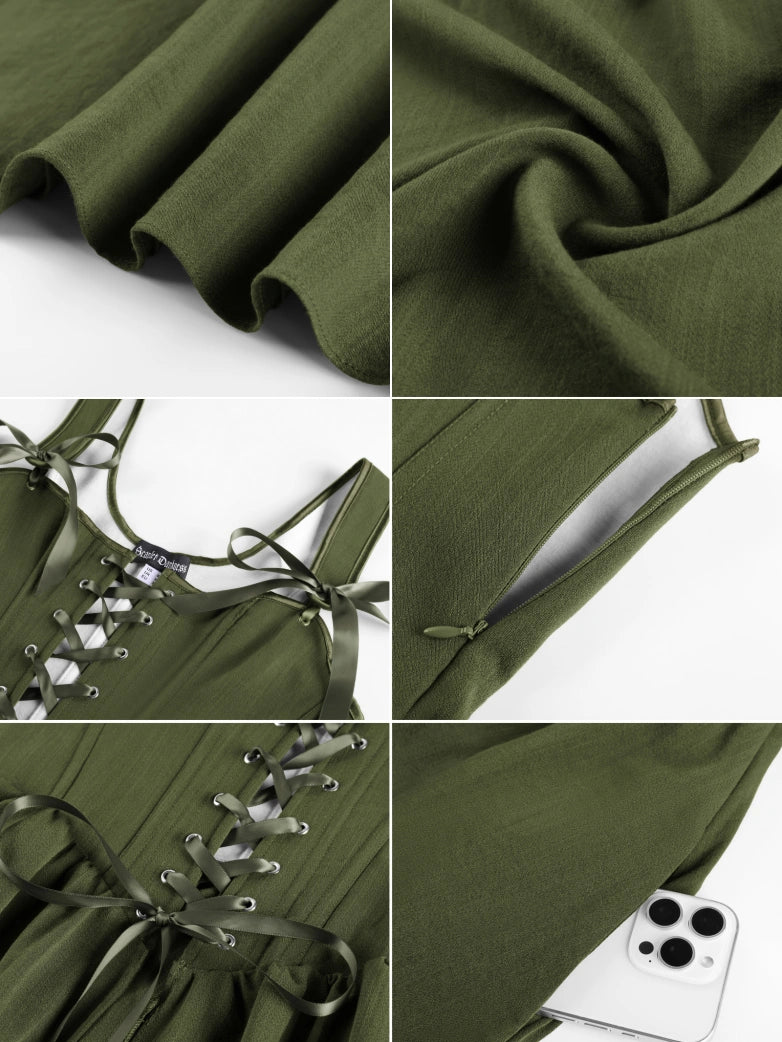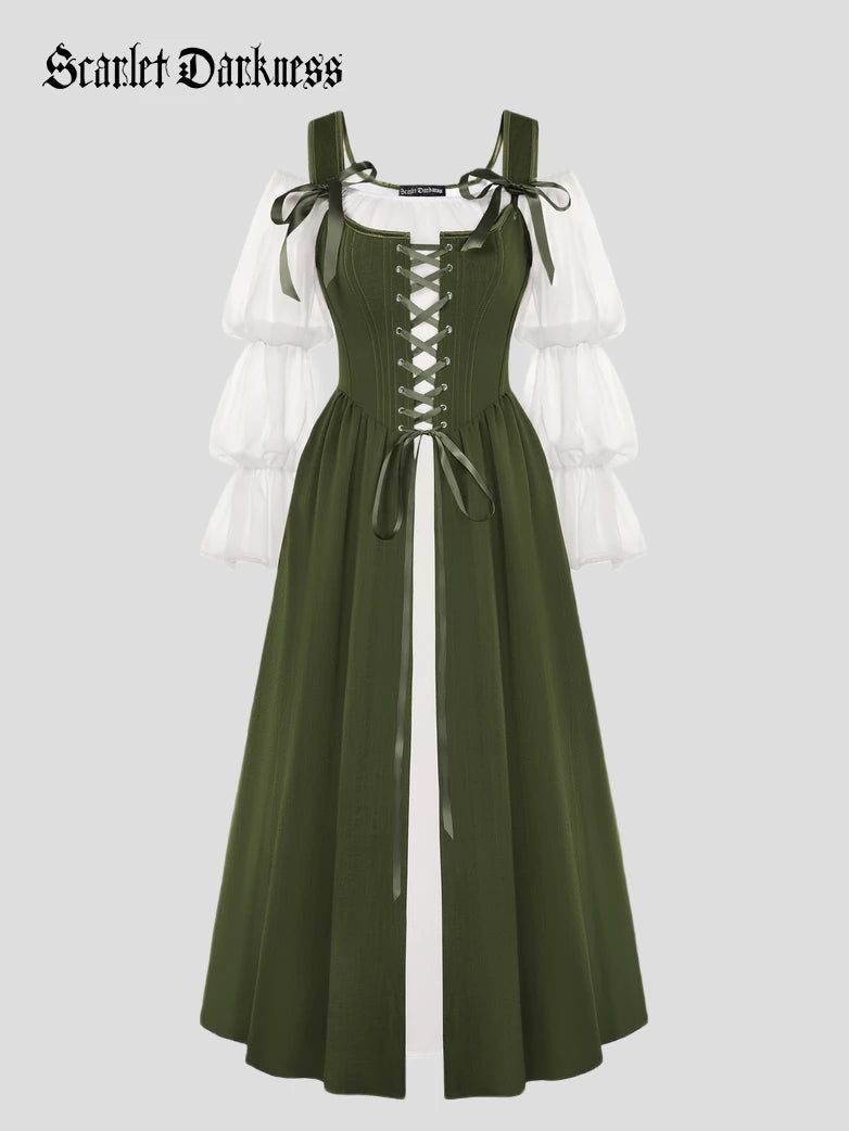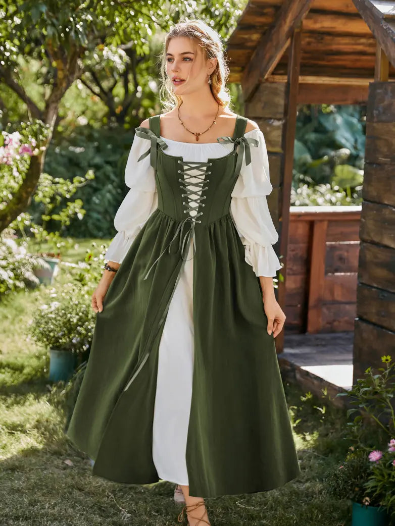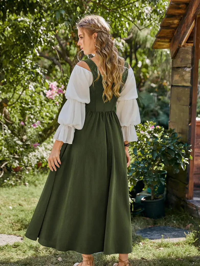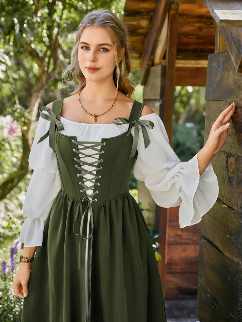 The olive-green coarse linen main skirt replicates the rustic texture of linen fabric, while white lantern sleeves echo the rolled-up cotton arm sleeves. The crisscrossing and lacing details at the chest recreate the practical structure of the corsets worn by commoners at the time, and the square neckline retains the clean lines of workwear.