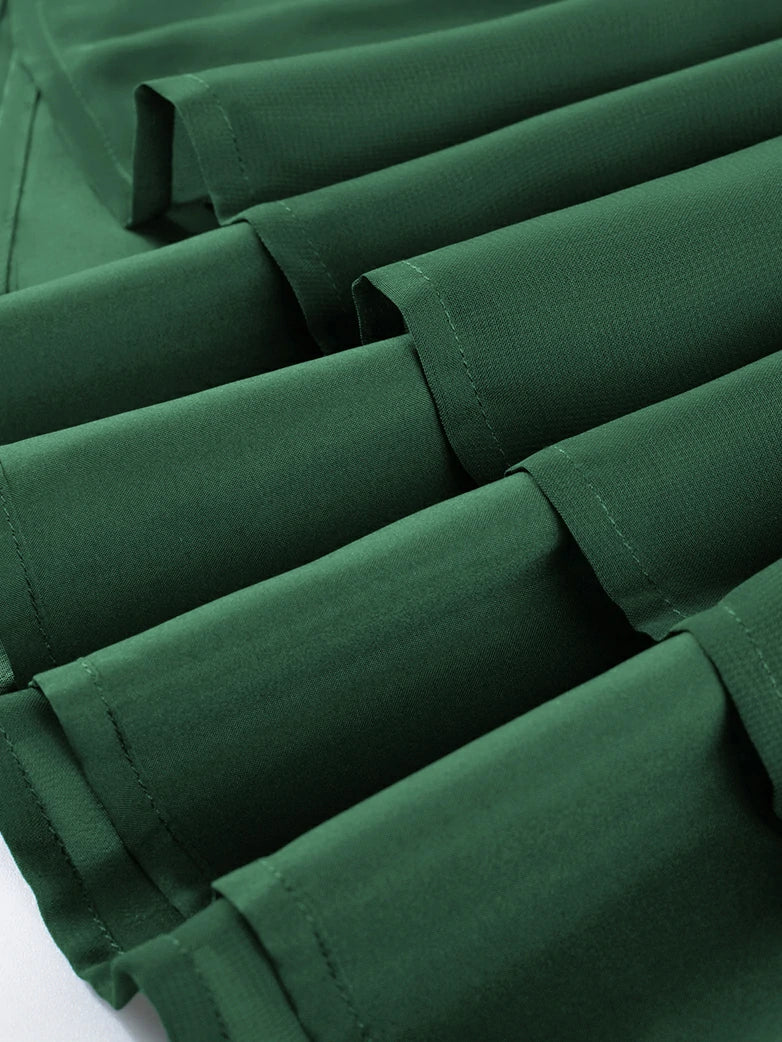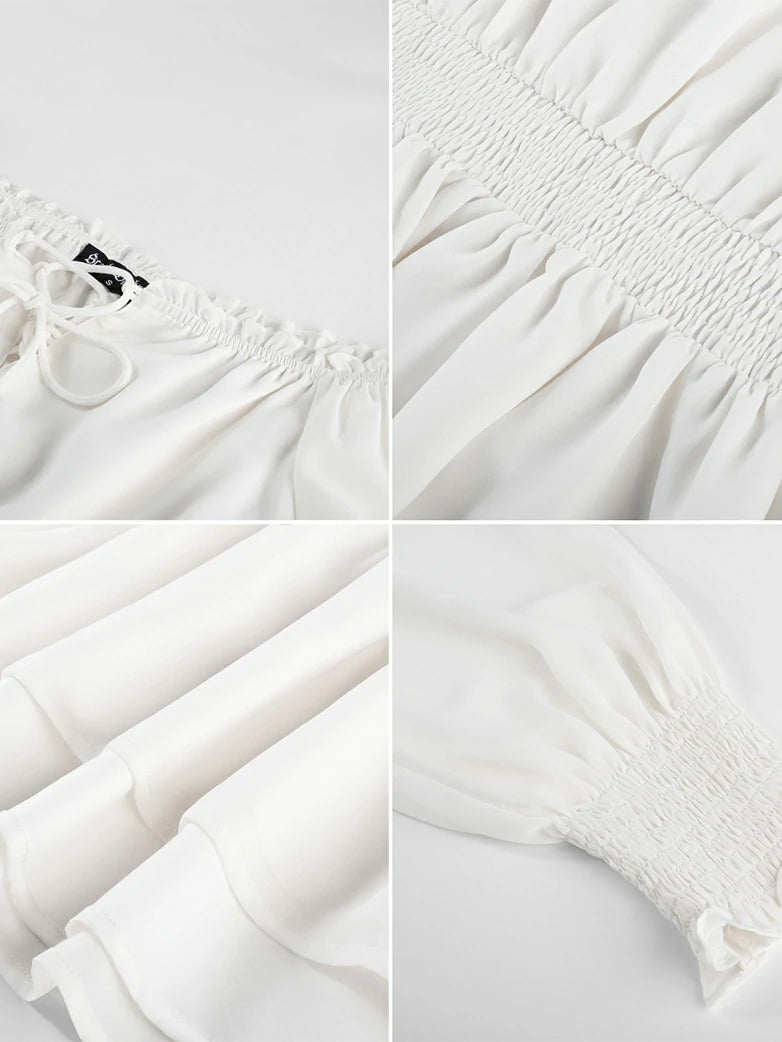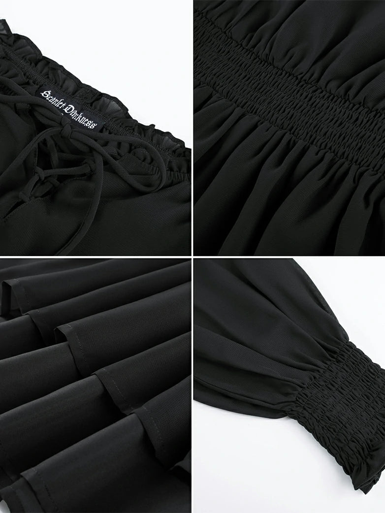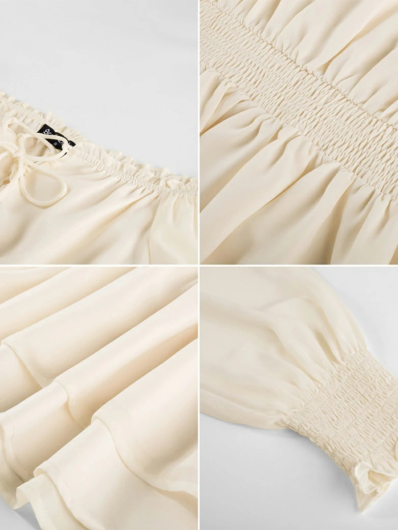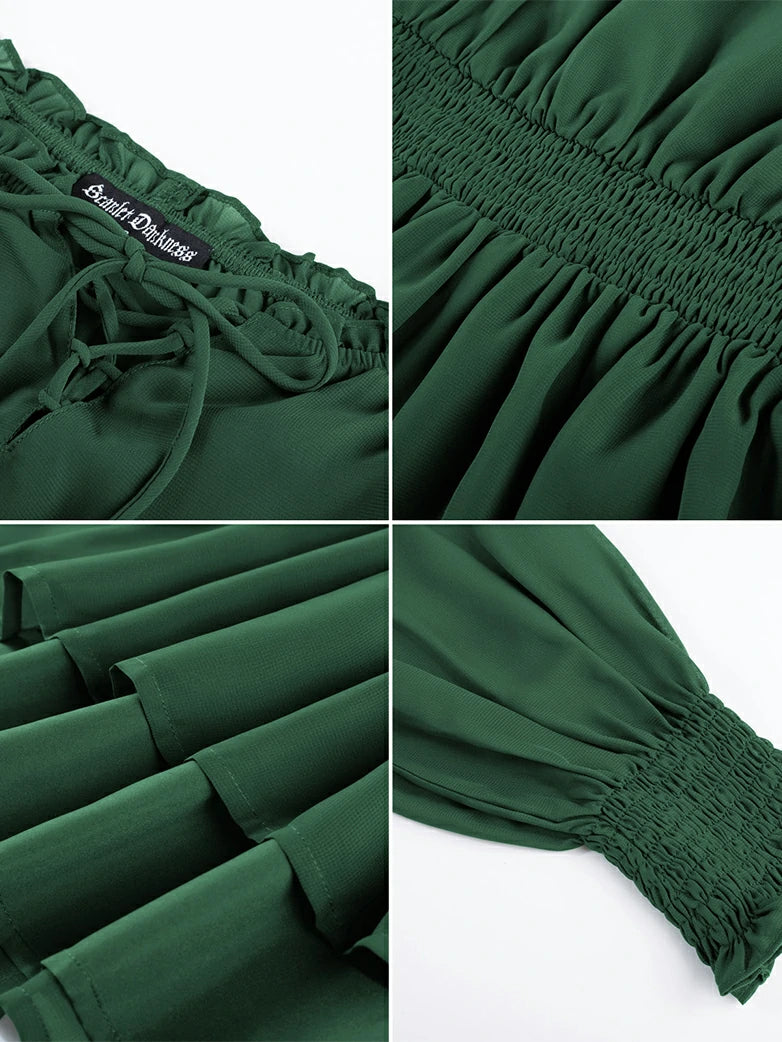 The off-the-shoulder neckline replicates the goddess's cascading shoulders, while the double-layered lantern sleeves unfold like wings. The cinched waist accentuates a classic, slender figure, and the neckline tie resembles entwined vines.
