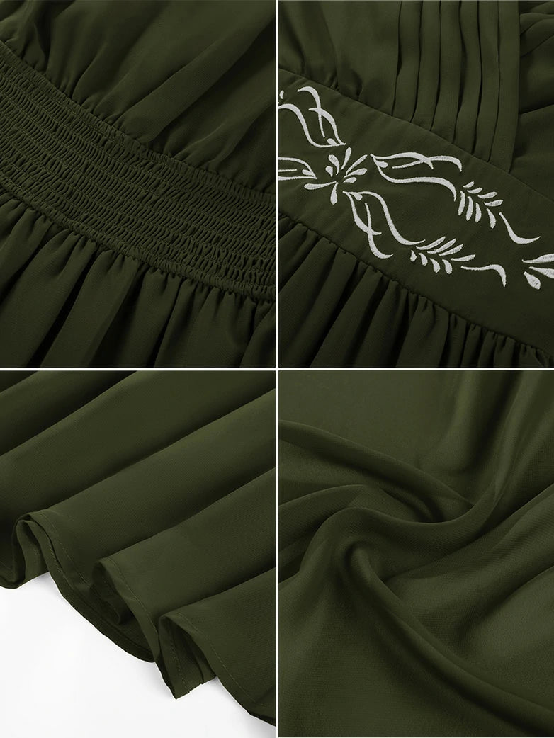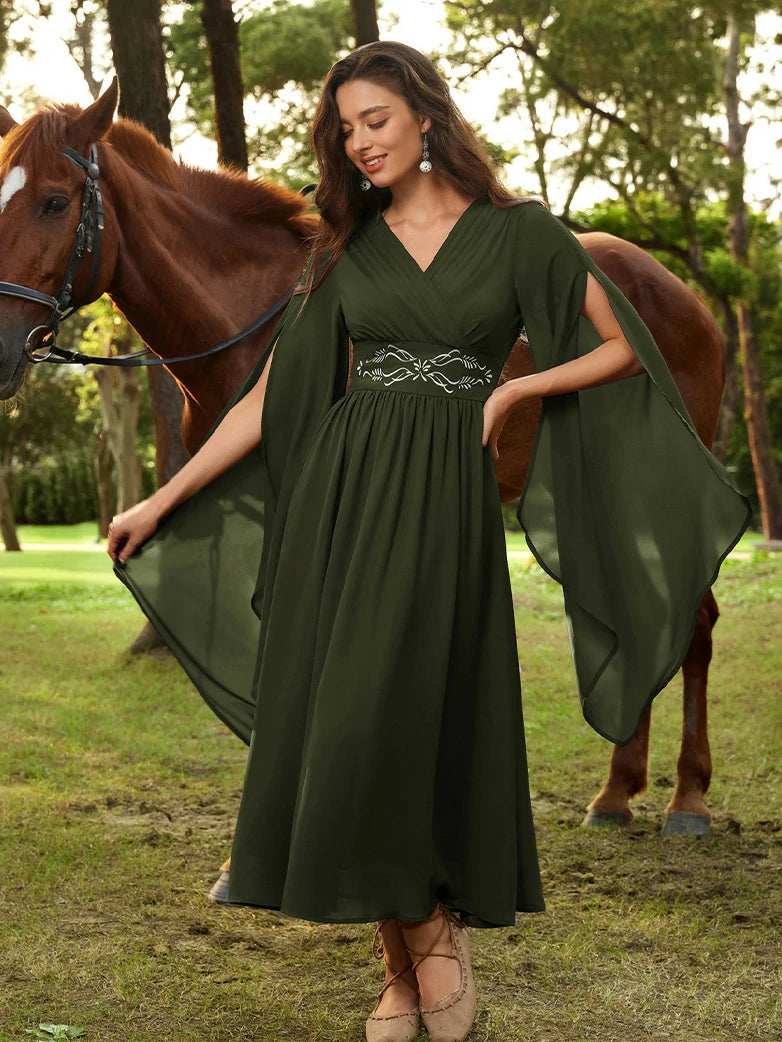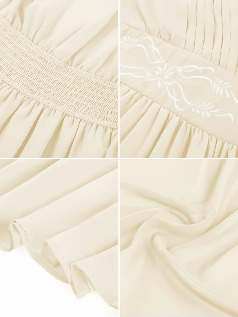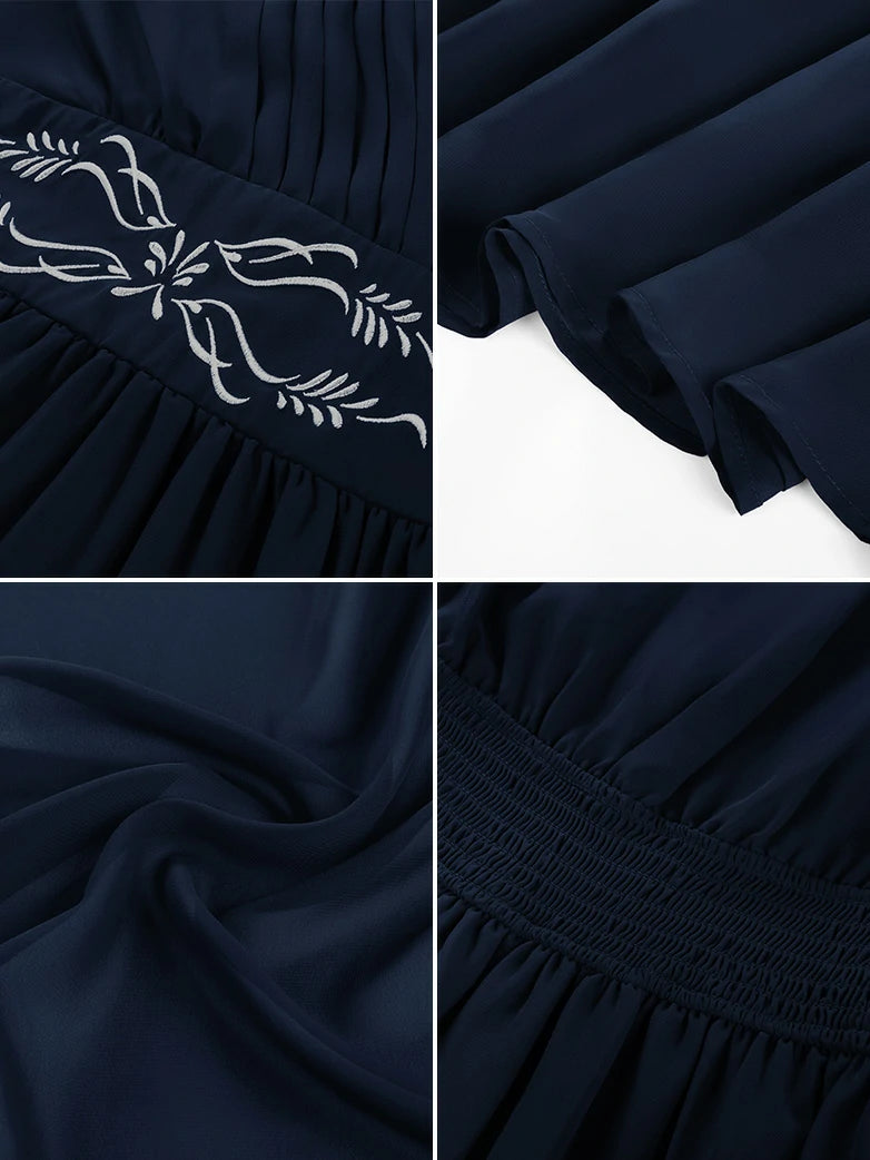 Step into a realm of whimsy with this enchanting chiffon dress, where delicate embroidery dances across flowing fabric. Perfect for renaissance fairs, fantasy festivals, or anyone craving a touch of magical elegance in their wardrobe.