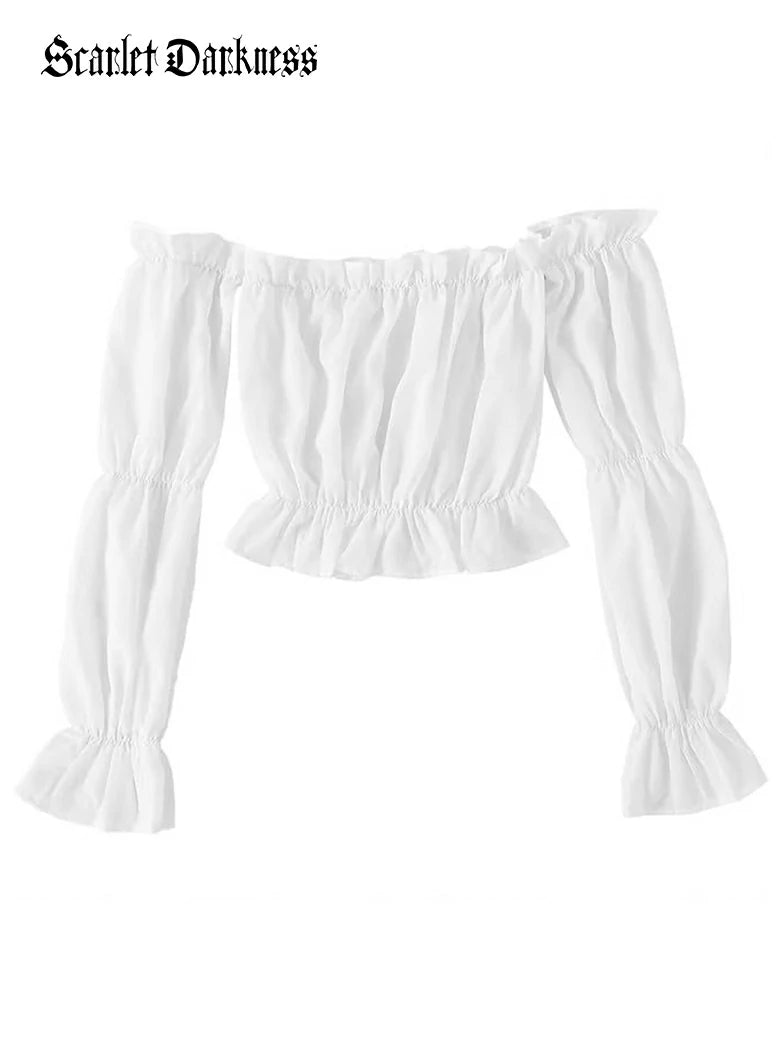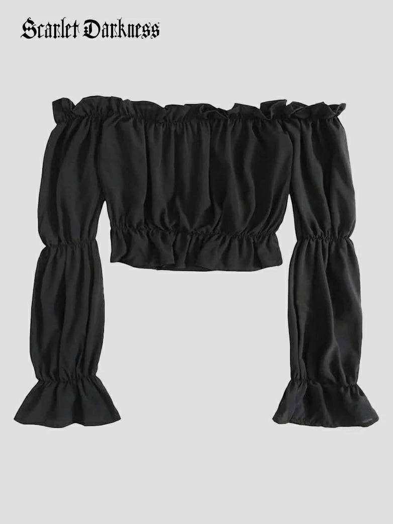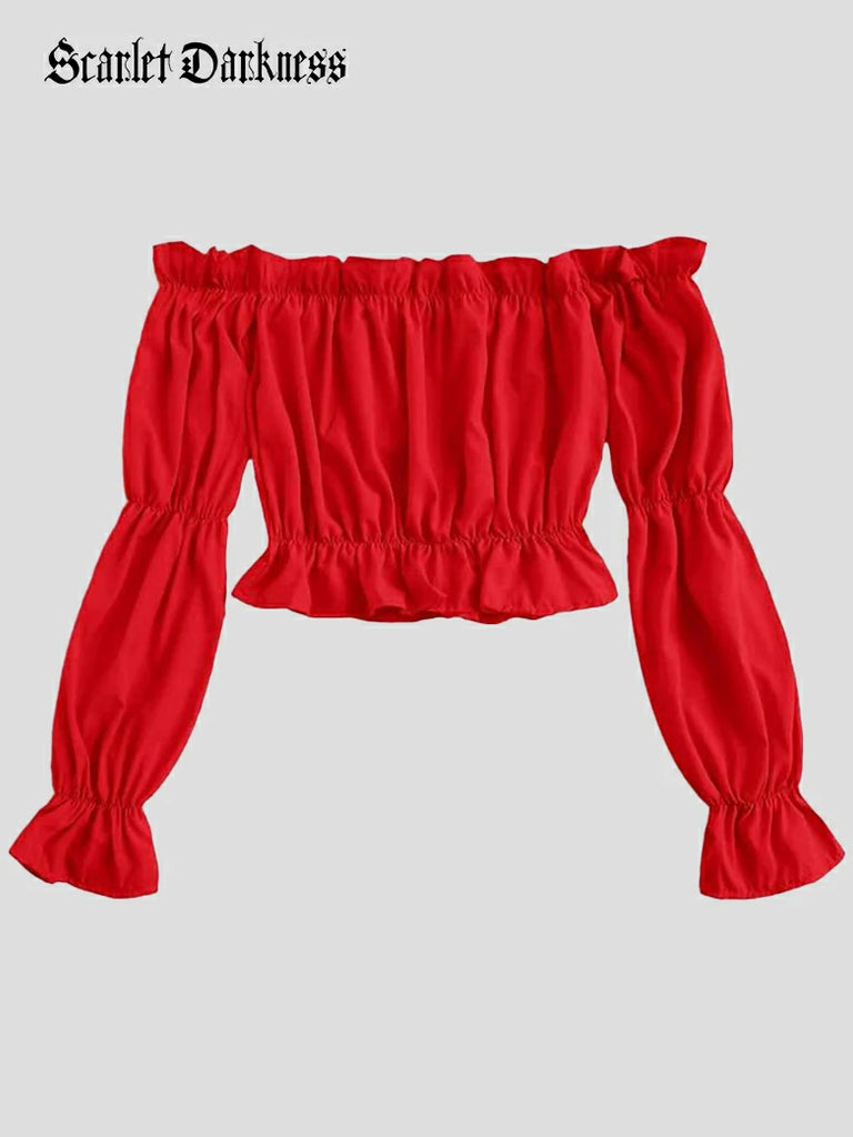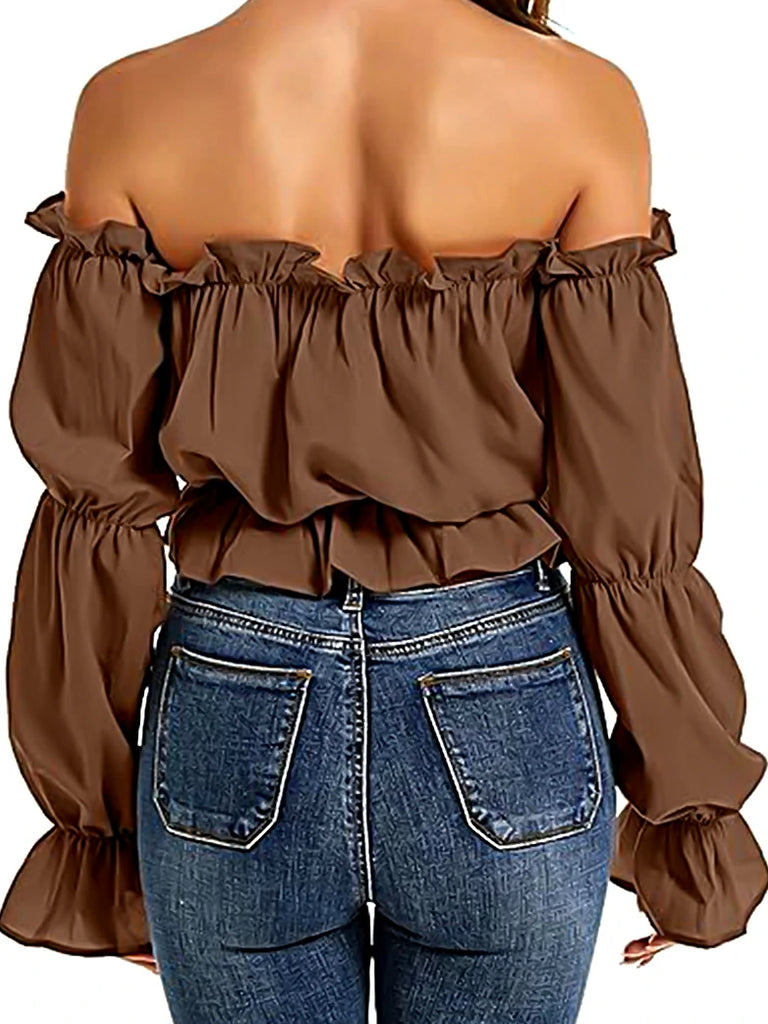 Indulge in elegance with the 2025 Renaissance Women's Off-The-Shoulder Ruffle Trim Puff Long Sleeve Bandeau Navel Shirt Top.