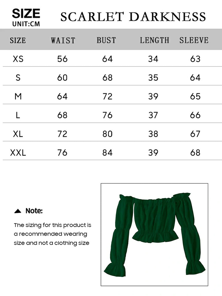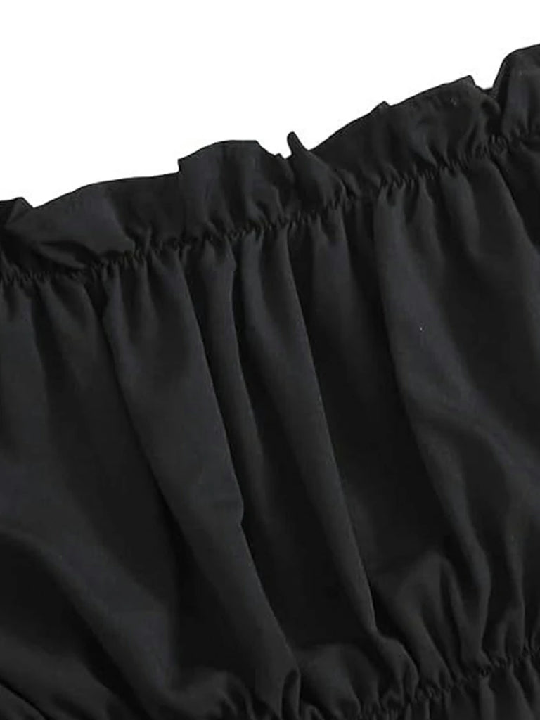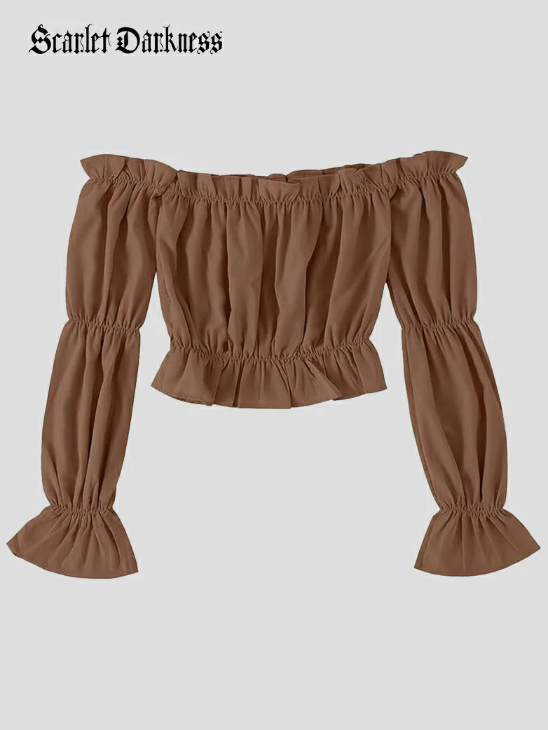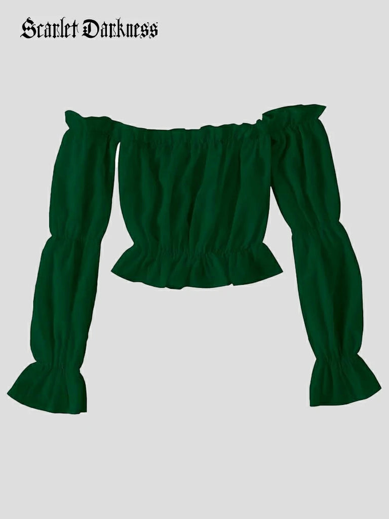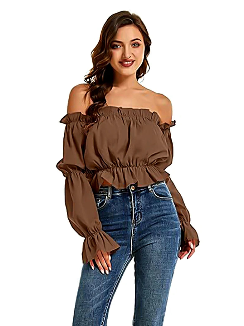 Indulge in elegance with the 2025 Renaissance Women's Off-The-Shoulder Ruffle Trim Puff Long Sleeve Bandeau Navel Shirt Top.