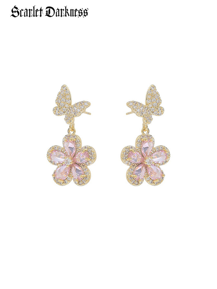Scarlet Darkness Romantic Floral Butterfly Drop Earrings